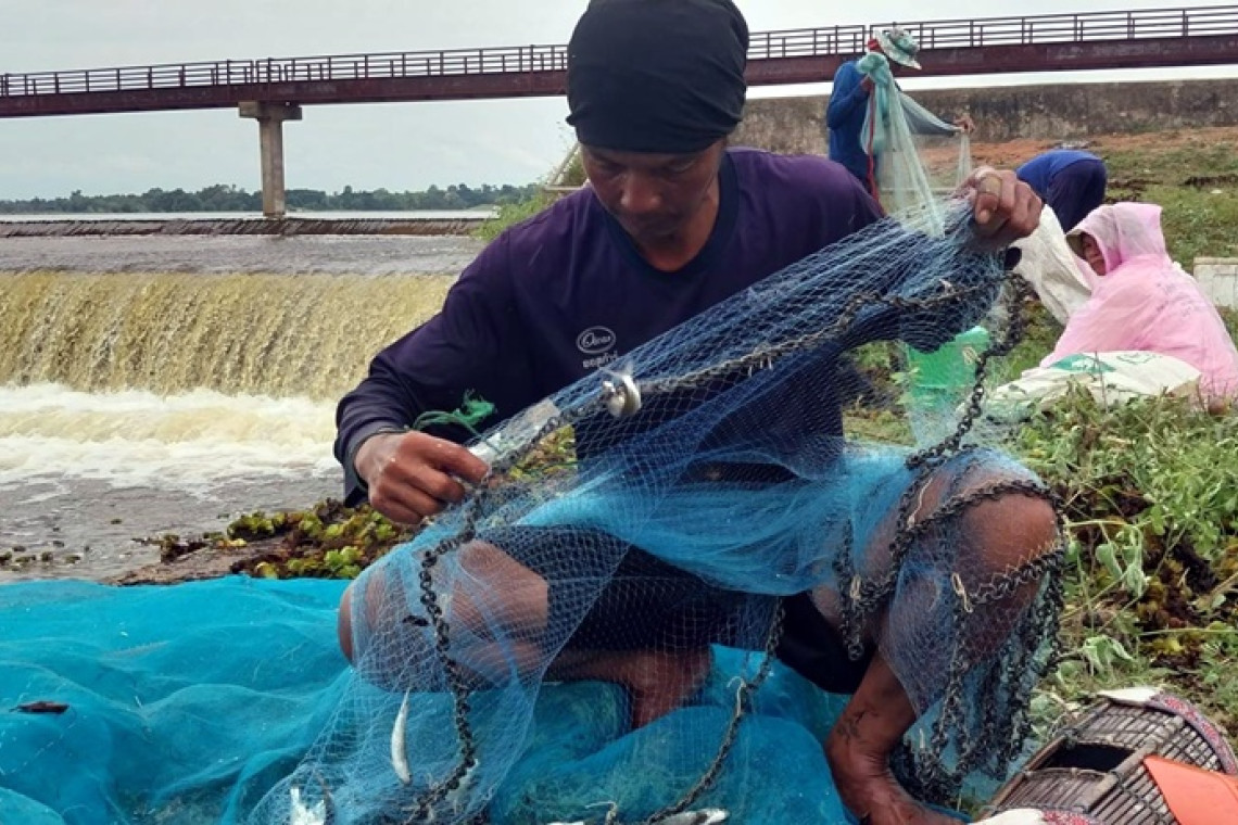 นายเบี้ยว สมสิทธิ อายุ 60 ปี ชาวบ้านเขนกอ่านว่า ขะ เนก ต.หนองขวาว อ.ศีขรภูมิ จ.สุรินทร์ได้พาครอบครัวนำแหและอวนเล็กมาลากหาจับปลาในบริเวณอ่างเก็บน้ำห้วยลำพอกโดยนายเบี้ยวบอกว่าหลังจากที่ตนเะองได้ไปร่วมถวายภัตตาหารเพลที่วัดกลับมาก็พาภรรยามาจับปลาเพื่อที่จะได้นำปลาไปประกอบอาหารและวันไหนได้มากก็จะนำไปแบ่งขายให้กับชาวบ้านเดียวกันด้วยแต่ส่วนมากจะไม่ถึงบ้านจะมีพี่น้องประชาชนที่เดินทางสัยจรไปมาจะแวะมาเห็นและซื้อกันตรงนั้นเลยและทำให้ตนเองมีรายได้วันละ 200 ถึง 300 บาท เพื่อจะได้ลดค่าใช้จ่ายในครัวเรืนออีกด้วยนายเบี้ยวกล่าว