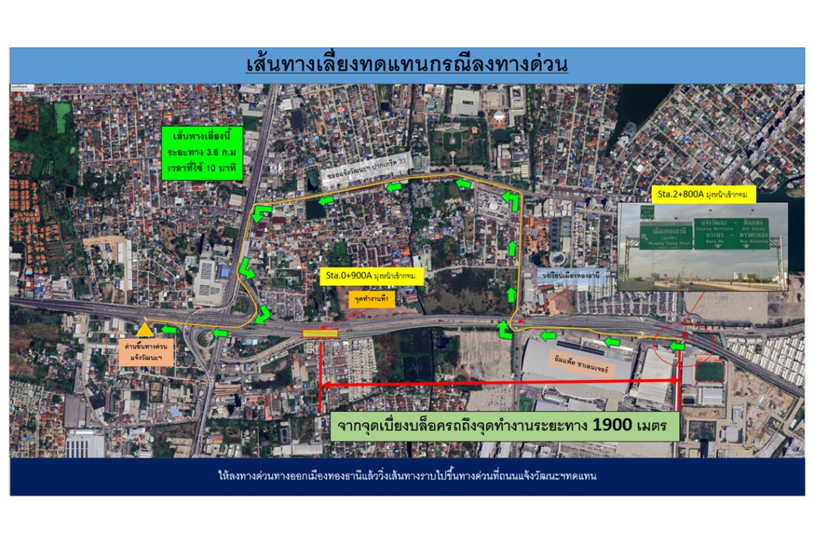 •จะมีการปิดการจราจรชั่วคราวทุกช่องจราจร เฉพาะขณะปฏิบัติงานเป็นระยะเวลา 20 นาที (จำนวน 2 รอบ) ตั้งแต่เวลา เวลา 00:00 – 00:20 น. และเวลา 00:50 – 01:10 น. ได้แก่ ฝั่งขาออก ช่องทางมุ่งหน้า ม.ธรรมศาสตร์ – บางปะอิน และปิดทางขึ้นด่านเก็บค่าผ่านทางพิเศษเมืองทองธานี ฝั่งขาออกจึงขอให้ผู้ใช้เส้นทางหลีกเลี่ยงและใช้เส้นทางทดแทนได้ดังนี้