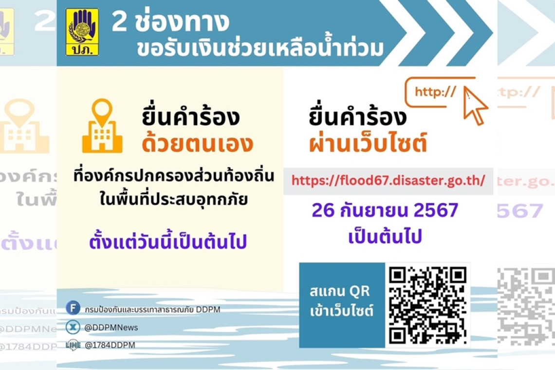 วันที่ 25 ก.ย.67 นายไชยวัฒน์ จุนถิระพงศ์ อธิบดีกรมป้องกันและบรรเทาสาธารณภัย (ปภ.) เปิดเผยว่า ตามที่กรมป้องกันและบรรเทาสาธารณภัย (ปภ.) ได้ประชุมชี้แจงแนวทางการให้ความช่วยเหลือผู้ประสบภัยเพื่อชี้แจงหลักเกณฑ์และแนวทางในการให้ความช่วยเหลือผู้ประสบภัย ขั้นตอนการดำเนินการ เพื่อให้เจ้าหน้าที่ผู้ปฏิบัติสามารถดำเนินการบริการประชาชนให้ได้รับเงินช่วยเหลือกรณีประสบอุทกภัยในช่วงฤดูฝน ปี 2567 โดยเร็วที่สุด และเพื่อให้ประชาชนเกิดความสะดวกในการยื่นคำร้องขอรับเงินช่วยเหลือ ปภ. จึงขอเน้นย้ำช่องทางการยื่นขอรับเงินช่วยหลือ ซึ่งประชาชนสามารถยื่นคำร้องได้ 2 ช่องทาง คือ ยื่นคำร้องด้วยตนเอง ที่องค์กรปกครองส่วนท้องถิ่นในพื้นที่ประสบอุทกภัย โดยประชาชนสามารถติดต่อดำเนินการได้ตั้งแต่วันนี้เป็นต้นไป