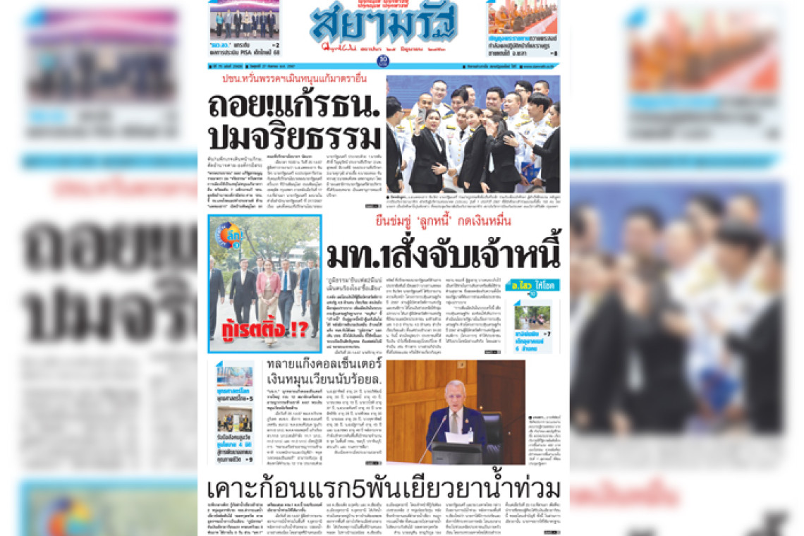 หน้า 1 หนังสือพิมพ์สยามรัฐรายวัน ฉบับวันศุกร์ที่ 27 กันยายน 2567