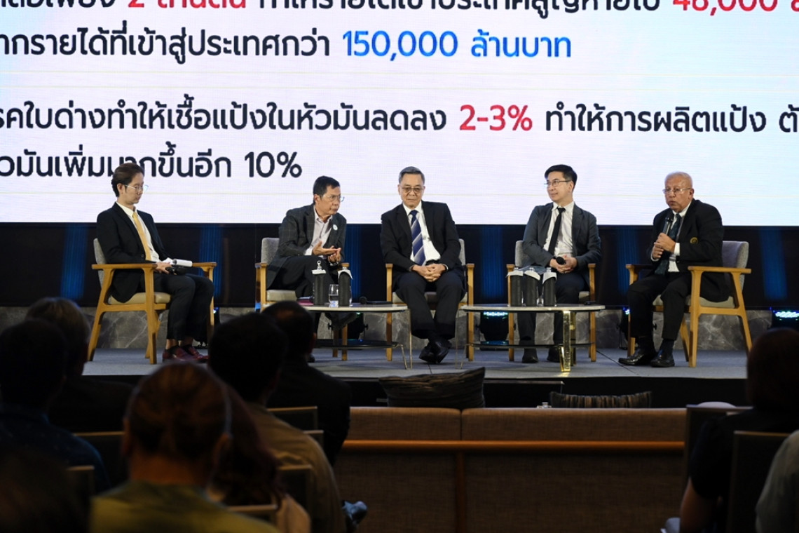 นายธำรงค์เดช อินทนิเวศน์ อุปนายกสมาคมการค้ามันสำปะหลังไทย เปิดเผยว่า “โรคใบด่างมันสำปะหลังเกิดจากเชื้อไวรัส” Cassava mosaic virus (CMV) ซึ่งสามารถแพร่กระจายได้จากการนำท่อนพันธุ์ที่ติดเชื้อไปปลูกและการระบาดผ่านแมลงหวี่ขาวยาสูบ การแพร่ระบาดของโรคนี้ได้สร้างความเสียหายอย่างหนักให้กับเกษตรกร และอุตสาหกรรมมันสำปะหลังของประเทศ โดยมีผลผลิตลดลงมากถึง 10-40% และหากไม่มีมาตรการควบคุมที่มีประสิทธิภาพ อาจส่งผลกระทบต่อปริมาณการส่งออก และเศรษฐกิจของประเทศในวงกว้าง ซึ่งมูลค่าความเสียหายคาดว่าอาจสูงถึง 100,000 ล้านบาทต่อปี