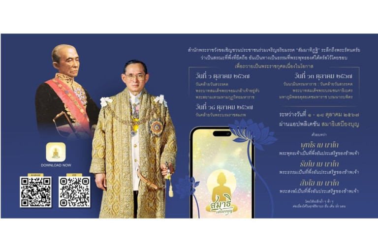 มหาภูมิพลอดุลยเดชมหาราช บรมนาถบพิตร ในวันที่ 13 ตุลาคม 2567 ผ่านแอปพลิเคชัน “สมาธิเสบียงบุญ” บันทึกเวลาการทำสมาธิเจริญจิตตภาวนา ตั้งแต่วันที่ 1 ตุลาคม 2567 วลา 08.00 น. ถึง วันที่ 18 ตุลาคม 2567 เวลา 08.00 น. ทั้งนี้ สามารถ ดาวน์โหลดแอปพลิเคชันได้ทั้ง Play Store และ App store