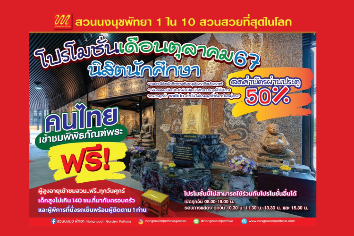 สวนนงนุชพัทยา จัดให้อีกนิสิตนักศึกษามหาวิทยาลัยลด 50 % สำหรับนักท่องเที่ยวชาวไทย เข้าชมพิพิธภัณฑ์พระฟรี ตลอดเดือนตุลาคม
