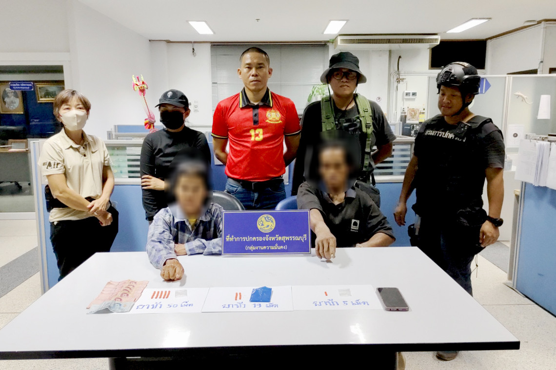 ที่จังหวัดสุพรรณบุรีเมื่อเวลา 01.30 น.วันที่ 27 ก.ย. 2567 ชุดปฏิบัติการพิเศษฝ่ายปกครองจังหวัดสุพรรณบุรี (ชุดไกรสีห์)โดยนายหมวดเอก ธรรศ ศรีดุษฎี ผู้ช่วยป้องกันจังหวัดสุพรรณบุรี นำกำลังจับกุมนางฉลอง อายุ 66 ปี อยู่บ้านเลขที่ 13 หมู่ที่ 8 ตำบลสระแก้ว อำเภอเมืองสุพรรณบุรี นายธนสิทธิ์ อายุ 47 ปี อยู่บ้านเลขที่ 95 หมู่ที่ 8 ตำบลสระแก้ว อำเภอเมืองสุพรรณบุรี พร้อมของกลาง ยาบ้า จำนวน 1 ถุง 50 เม็ด สำเนาธนบัตรที่ใช้ในการล่อซื้อยาเสพติด สำเนาภาพหน้าจอโทรศัพท์นางฉลองฯ เงินสด จำนวน 10,200 บาท