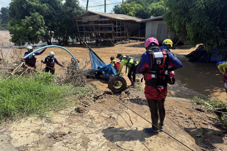 วันที่ 28 ก.ย.67 ที่ถนนสุโขทัย-วังไม้ขอน ม.6 ต.วังใหญ่ อ.ศรีสำโรง จ.สุโขทัย น้ำยังท่วมสูงเนื่องจากน้ำที่เอ่อล้นออกมาจากแม่น้ำยม อย่างต่อเนื่อง ขณะที่ทีมกู้ภัยฯ ยังฝ่ากระแสน้ำกลางชุมชนเข้าช่วยเหลือประชาชนอย่างต่อเนื่อง โดยเฉพาะ บางพื้นที่น้ำท่วมสูงเกือบ 2 เมตร กระแสน้ำไหลเชี่ยวจนถนนขาด ไม่สามารถเดินทางเข้า-ออก พื้นที่ได้