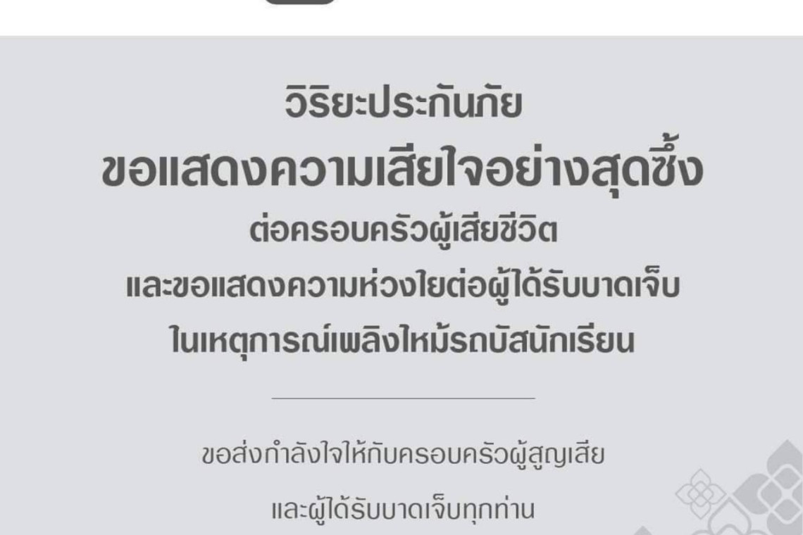 อย่างไรก็ตาม บริษัทฯ ได้จัดส่งเจ้าหน้าที่ไปประสานงานกับหน่วยงานที่เกี่ยวข้องแล้ว และบริษัทฯ พร้อมที่จะจ่ายสินไหมทดแทนแก่ทายาทตามกฎหมายของผู้เสียชีวิต และผู้ที่ได้รับบาดเจ็บ ตามสิทธิประโยชน์ที่ระบุไว้ในเงื่อนไขความคุ้มครองของกรมธรรม์ รวมถึงการจัดส่งเจ้าหน้าที่เข้าไปดูแลและให้กำลังใจครอบครัวผู้ที่ได้รับบาดเจ็บ พร้อมทั้งประสานงานกับโรงพยาบาลเพื่ออำนวยความสะดวกในเรื่องต่าง ๆ เป็นที่เรียบร้อยแล้ว