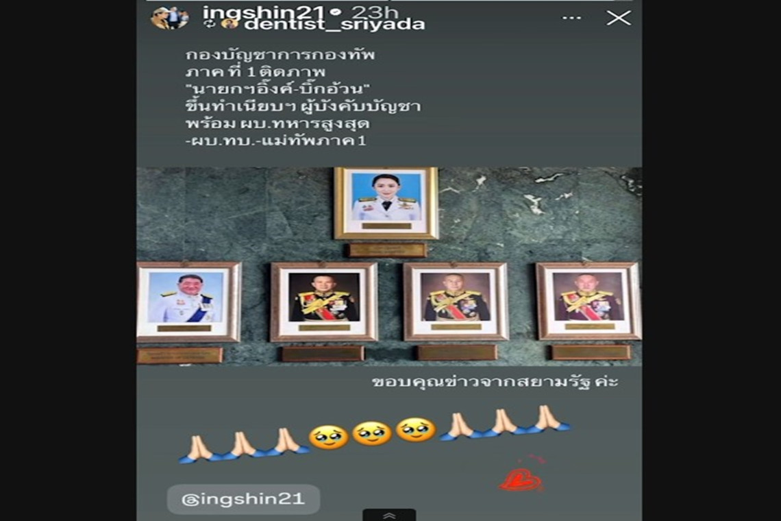 ล่าสุด เมื่อวันที่ 2 ต.ค.67 ผู้สื่อข่าวรายงานว่า "นางสาวแพทองธาร ชินวัตร" นายกรัฐมนตรี ได้โพสต์อินสตาร์แกรมส่วนตัว "ingshin21" คลิปภาพทำเนียบผู้บังคับบัญชา กองบัญชาการกองทัพภาคที่ 1 พร้อมข้อความระบุว่า "ขอบคุณข่าวจากสยามรัฐ ค่ะ"