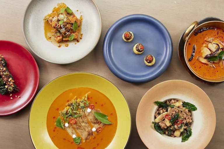 ร้านอาหารไทยจิม ทอมป์สัน พร้อมเสิร์ฟ 6 เมนูเจที่ครบทั้งรสชาติและความคิดสร้างสรรค์ เริ่มจากจานเรียกน้ำย่อยอย่าง ม้าฮ่อ ของว่างไทยดั้งเดิมช่วงรัตนโกสินทร์ อร่อยกับความกรุบกรอบของแมคคาเดเมียที่เคี่ยวกับน้ำตาลมะพร้าวจนได้ที่ รับประทานคู่กับสับปะรดภูเก็ตย่างให้รสชาติเปรี้ยวหวานลงตัว ต่อด้วยเมี่ยงย่าง ที่ใช้ใบชะพลูกลิ่นหอมมาห่อไส้เจจากโปรตีนถั่วเหลืองแทนที่เนื้อวัว นำมาย่างไฟให้หอมและราดด้วยน้ำพริกเผามะขามรสชาติกลมกล่อม อีกหนึ่งเมนูเรียกน้ำย่อยรสจัดจ้าน พล่าเต้าหู้เห็ดหอม นำเต้าหู้เห็ดหอมชิตาเกะย่างมาคลุกเคล้ากับน้ำยำสมุนไพรรสชาติถึงใจ