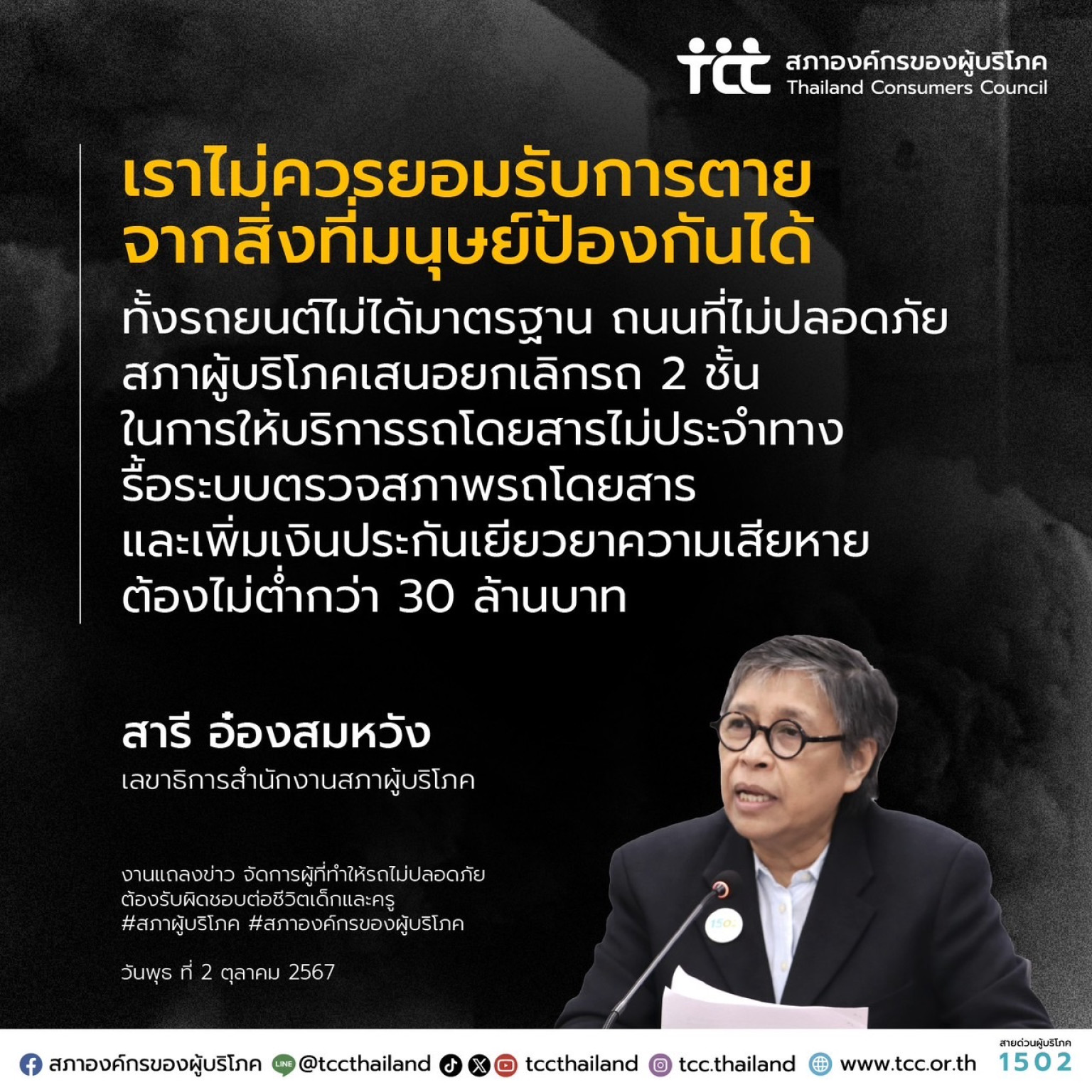 วันที่ 2 ต.ค.67 เพจ สภาองค์กรของผู้บริโภค โพสต์ข้อความระบุว่า องค์กรผู้บริโภค และ สภาผู้บริโภค เสนอ ให้ยกเลิกการใช้งานรถสองชั้นมาหลายปีแต่ยังไม่มีการดำเนินการยังมีรถสองชั้นที่เกิดอุบัติเหตุเนืองๆ รถที่เกิดอุบัติเหตุเป็นรถชั้นครึ่ง