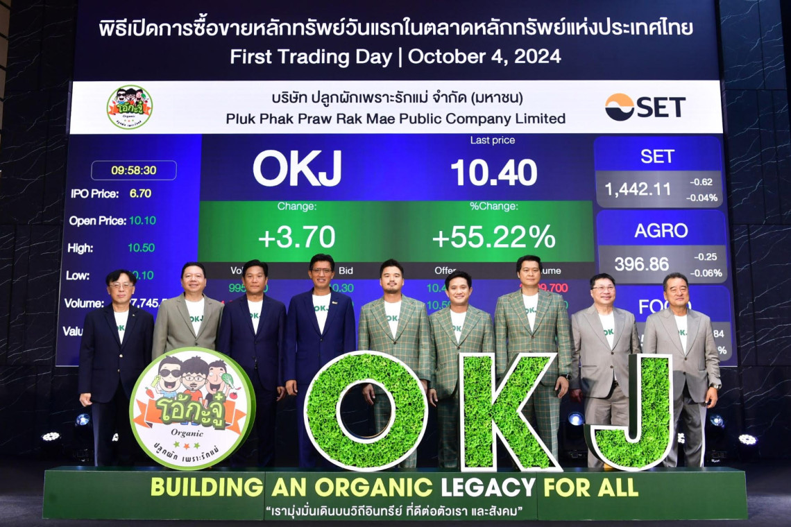 เมื่อวันที่ 4 ตุลาคม 2567 ราคาหุ้น บมจ.ปลูกผักเพราะรักแม่ (OKJ) เปิดการซื้อขายวันแรกในตลาดหลักทรัพย์แห่งประเทศไทย (SET) ที่ 10.10 บาท จากราคา IPO หุ้นละ 6.70 บาท