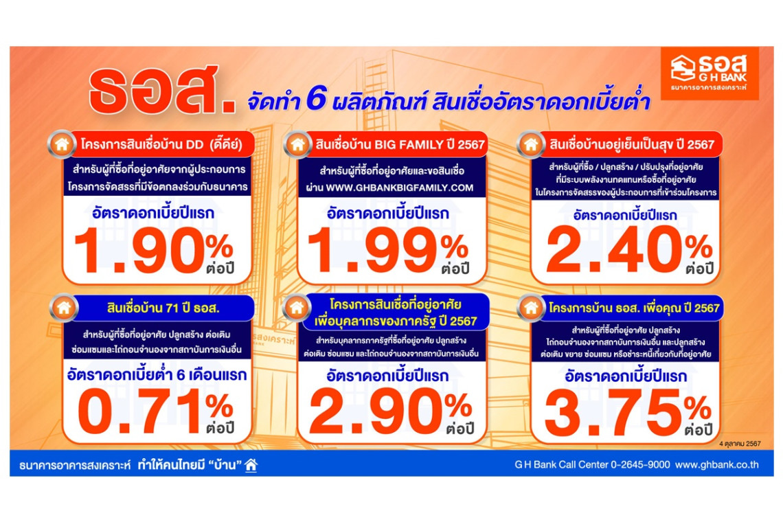 เมื่อวันที่ 4 ตุลาคม 2567 นายกมลภพ วีระพละ กรรมการผู้จัดการ ธนาคารอาคารสงเคราะห์ (ธอส.) เปิดเผยว่า ธอส. ในฐานะสถาบันการเงินของรัฐ ที่มีพันธกิจ “ทำให้คนไทยมีบ้าน” พร้อมสนับสนุนคนไทยให้ได้มีที่อยู่อาศัยเป็นของตนเอง ตามนโยบายรัฐบาลและกระทรวงการคลังในการลดความเหลื่อมล้ำทางสังคม ผ่านการมีที่อยู่อาศัยอย่างเหมาะสม จึงได้จัดทำ 6 ผลิตภัณฑ์สินเชื่ออัตราดอกเบี้ยต่ำในช่วงท้ายของปี 2567 ที่ครอบคลุมลูกค้าทุกกลุ่มสาขาอาชีพและอายุ ให้มีบ้านได้ง่ายขึ้นด้วยการผ่อนชำระเงินงวดต่ำ