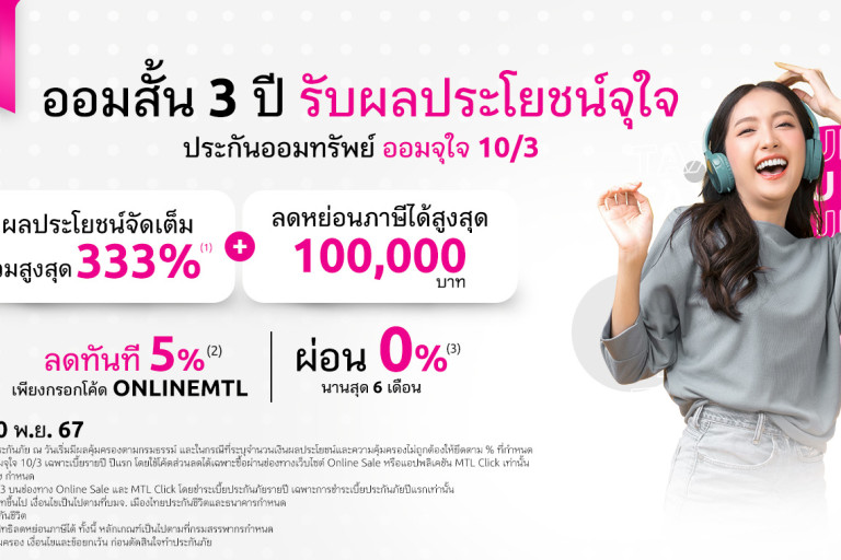โดยความโดดเด่นของ ประกันออมทรัพย์ “ออมจุใจ 10/3” อยู่ที่การตอบโจทย์ความต้องการแบบจุใจทั้งด้านการออม ผลประโยชน์ทางภาษี และความคุ้มครองชีวิต ด้วยผลประโยชน์รวมสูงสุด 333%(1) จ่ายเบี้ย สั้น ๆ 3 ปี แต่คุ้มครองยาวถึง 10 ปี ลดหย่อนภาษีสูงสุด 100,000 บาท รับเงินคืนทุกปีกรมธรรม์ปีละ 1%(1) ซื้อออนไลน์ ไม่ต้องตรวจและไม่ต้องคำถามสุขภาพ(2) ซื้อได้ตั้งแต่อายุ 20-80 ปี สะดวกในการเลือกซื้อเพียงเข้าไปที่ webmtl.co/47yeSNn มีให้เลือกได้จุใจถึง 5 แผน เลือกได้ในแบบที่เป็นคุณ