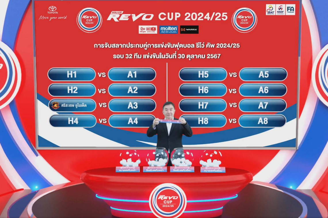 สมาคมกีฬาฟุตบอลแห่งประเทศไทย ในพระบรมราชูปถัมภ์ พร้อมด้วย บริษัท ไทยลีก จำกัด ร่วมกับ บริษัท โตโยต้า มอเตอร์ ประเทศไทย จำกัด บริษัท ไทยเซ็นทรัลเคมี จำกัด (มหาชน) บริษัท วอริกซ์ สปอร์ต จำกัด (มหาชน) บริษัท มอลเทน (ไทยแลนด์) จำกัด ผู้สนับสนุนหลัก จัดพิธีจับสลากฟุตบอลถ้วยที่ยิ่งใหญ่ของประเทศไทย รายการ รีโว่ คัพ 2024/25 รอบ 32 ทีม ภายในพิธีจับสลากได้รับเกียรติจาก พันตำรวจโท หม่อมหลวง กิติบดี ประวิตร เลขาธิการสมาคมกีฬาฟุตบอลแห่งประเทศไทย ในพระบรมราชูปถัมภ์ ที่ให้เกียรติจับสลากประกบคู่การแข่งขันในวันนี้