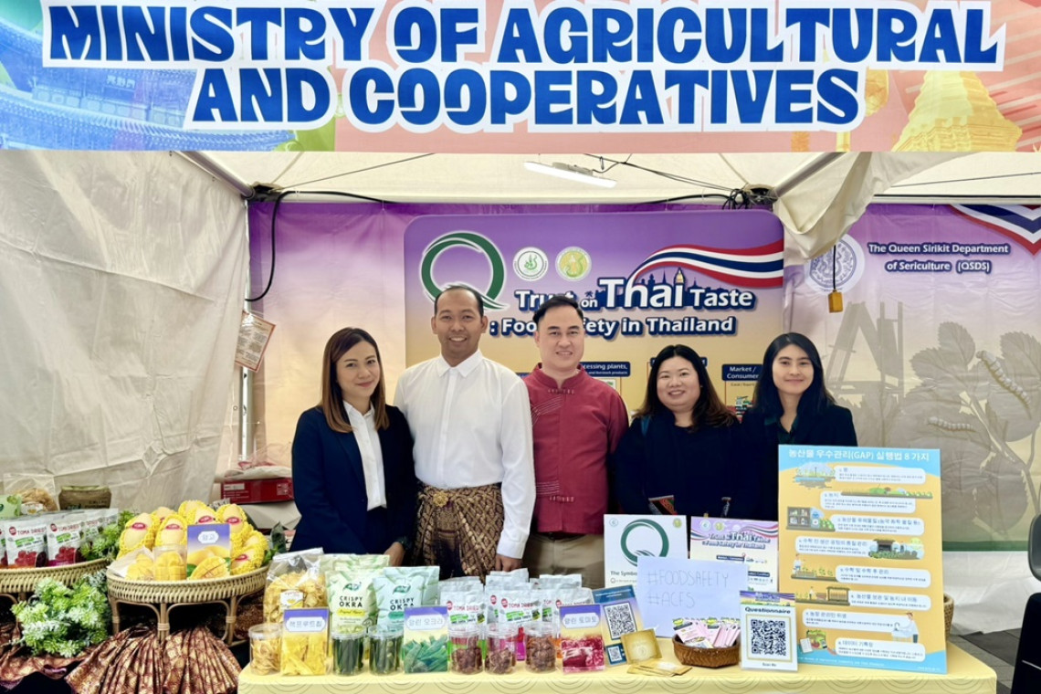 สำนักงานมาตรฐานสินค้าเกษตรและอาหารแห่งชาติ (มกอช.) กระทรวงเกษตรและสหกรณ์ ร่วมจัดกิจกรรมให้ความรู้เรื่อง มาตรฐานสินค้าเกษตรและอาหารปลอดภัยของไทย Trust on Thai Taste : Food Safety in Thailand รวมทั้งเครื่องหมาย Q แก่ผู้บริโภคชาวเกาหลี ในงาน Sawasdee Seoul Thai Festival 2024 ณ กรุงโซล สาธารณรัฐเกาหลี ระหว่างวันที่ 5-6 ตุลาคม 2567 ณ ลานหน้าคลองซองเก กรุงโซล สาธารณรัฐเกาหลี โดยมีนายธานี แสงรัตน์ เอกอัครราชทูต ณ กรุงโซล และ นายดุสิต เมนะพันธุ์ ที่ปรึกษารัฐมนตรีว่าการกระทรวงการต่างประเทศ เป็นประธาน ร่วมด้วย H.E. Sohn Jie-ae, Ambassador for Cultural Cooperation, Ministry of Foreign Affairs of the Republic of Korea