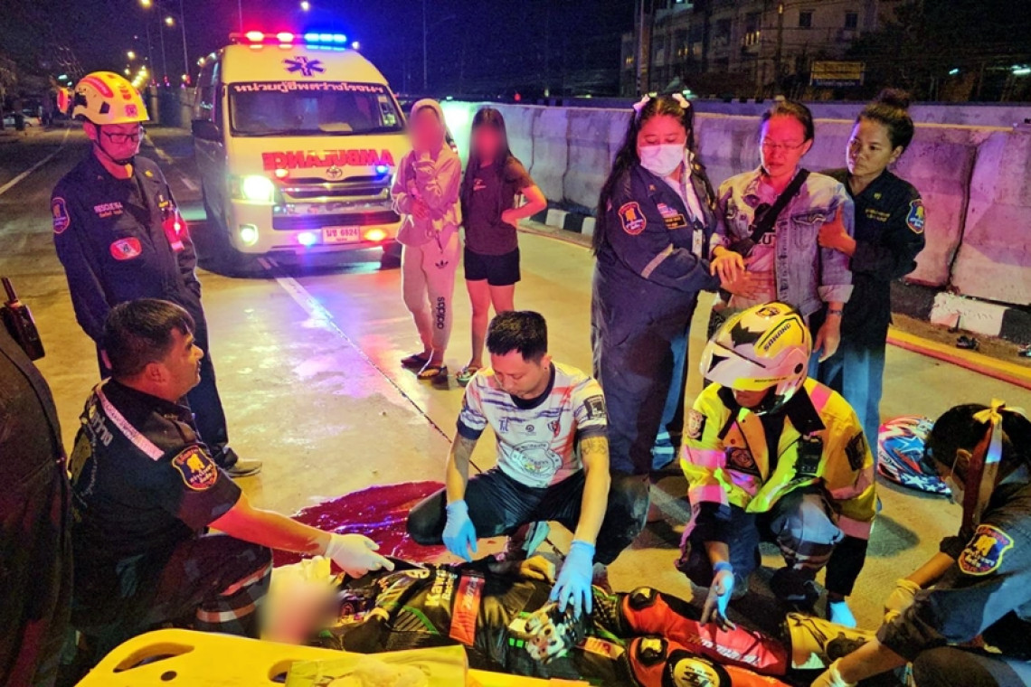 เมื่อเวลา 20.40 น. วันที่ 5 ต.ค.67 พ.ต.ท.ธัมมัญชิษฐ์ สิทธิศาสตร์ รอง ผกก.สอบสวน สภ.สัตหีบ ได้รับแจ้งเหตุ มีชาวต่างชาติขี่รถ จยย. ชนป้ายทางขึ้นสะพานกลับรถ หน้าร้านบุญถาวร ขาเข้าสัตหีบ ถนนสุขุมวิท ต.บางเสร่ อ.สัตหีบ จ.ชลบุรี อาการสาหัส ก่อนรุดไปตรวจสอบ พร้อมหน่วยกู้ชีพ รพ.สัตหีบ กม.10 หน่วยกู้ภัยมูลนิธิสว่างโรจนธรรมสถานสัคหีบ