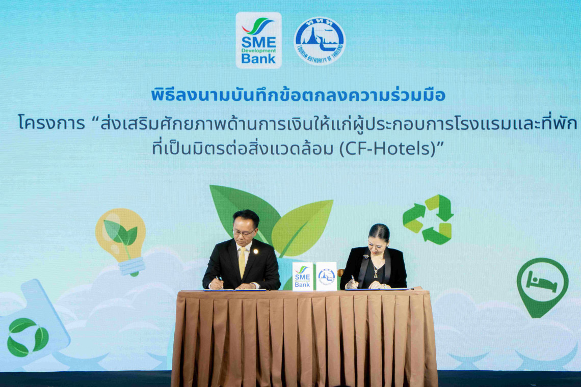 วันที่ 7 ต.ค.67 ผู้สื่อข่าวรายงาน ว่า การท่องเที่ยวแห่งประเทศไทย (ททท.) ร่วมกับธนาคารพัฒนาวิสาหกิจขนาดกลาง และขนาดย่อมแห่งประเทศไทย (ธพว.) หรือ SME D Bank เดินหน้าส่งเสริมการท่องเที่ยวอย่างยั่งยืน มุ่งสนับสนุนผู้ประกอบการโรงแรมและที่พักเร่งปรับปรุงธุรกิจให้เป็นมิตรต่อสิ่งแวดล้อมลงนามบันทึกข้อตกลงความร่วมมือโครงการส่งเสริมศักยภาพด้านการเงินให้แก่ผู้ประกอบการโรงแรมและที่พักที่เป็นมิตรต่อสิ่งแวดล้อม (CF-Hotels)
