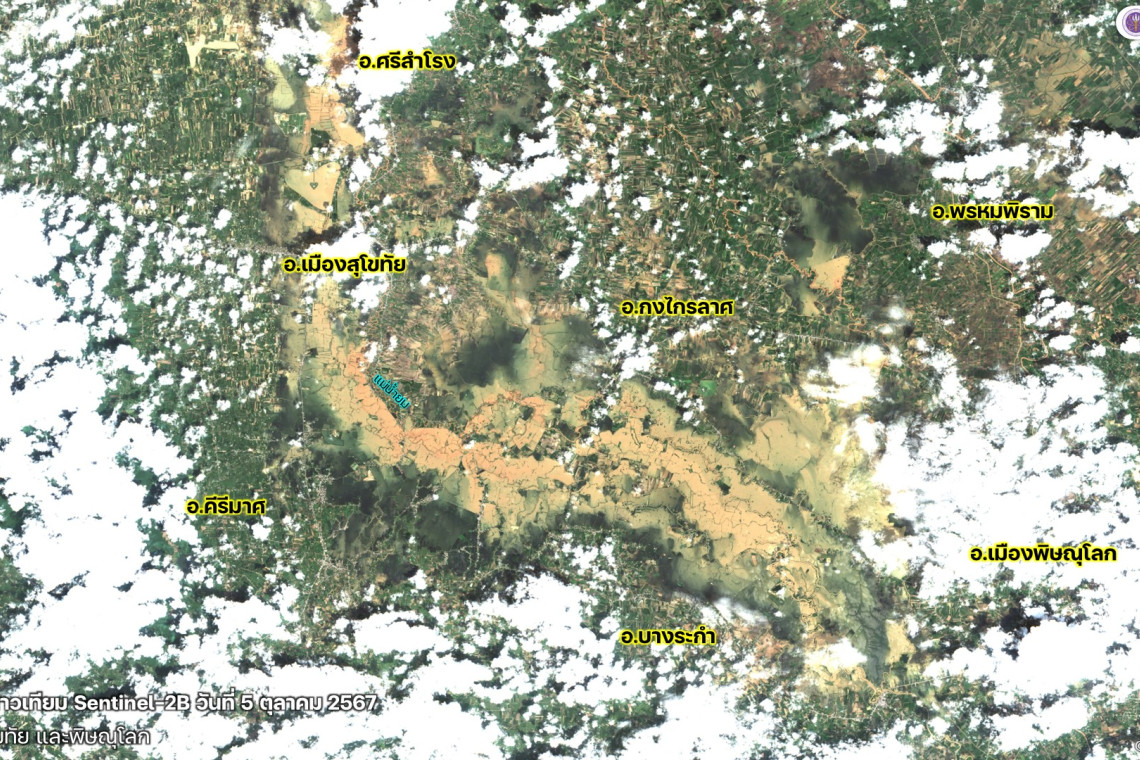 GISTDA เผยภาพจากดาวเทียม Sentinel-2B บันทึกภาพเมื่อวันที่ 5 ตุลาคม 2567 บริเวณของจังหวัดสุโขทัย และพิษณุโลก ที่ได้รับผลกระทบจากฝนที่ตกลงมาอย่างต่อเนื่อง จนทำให้แม่น้ำยมล้นตลิ่ง ส่งผลให้หลายอำเภอเกิดน้ำท่วมขัง ซึ่งส่วนใหญ่เป็นพื้นที่เกษตร เส้นทางคมนาคม และพื้นที่ที่อยู่อาศัยบางส่วน