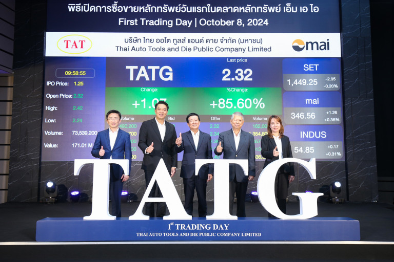 โดย TATG เปิดเทรดวันแรกที่ 2.32 บาท เพิ่มขึ้น 85.60% เหนือราคาจอง (IPO) ที่ 1.25 บาท ตอกย้ำความเชื่อมั่นบริษัทผู้นำในธุรกิจออกแบบและผลิตเครื่องมือสำหรับอุตสาหกรรมรถยนต์ ครอบคลุมถึงการออกแบบและผลิตแม่พิมพ์โลหะ อุปกรณ์จับยึดเพื่อการตรวจสอบ อุปกรณ์จับยึดเพื่อการประกอบ และผลิตชิ้นส่วนรถยนต์ ได้รับการยอมรับในระดับภูมิภาคเอเชีย