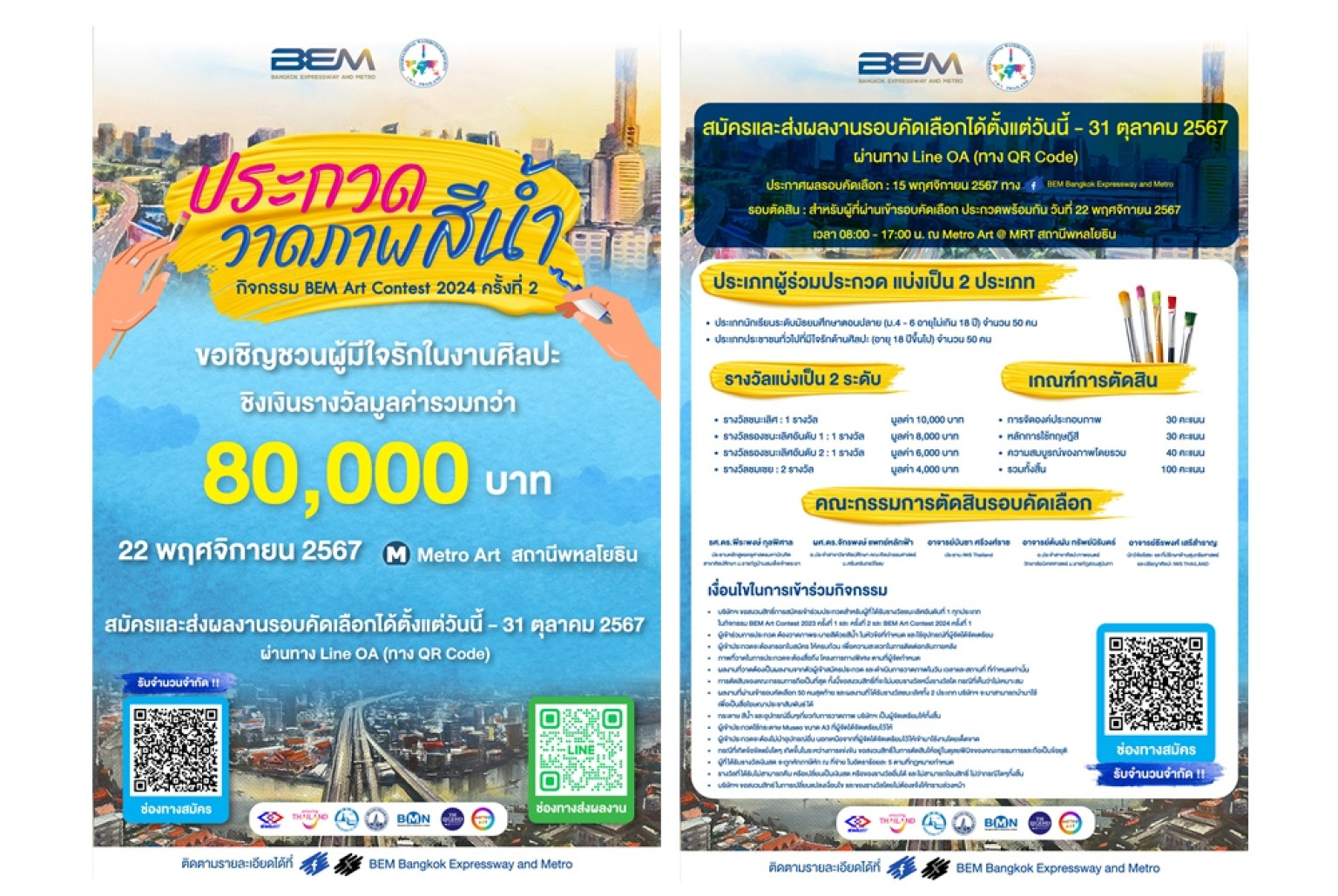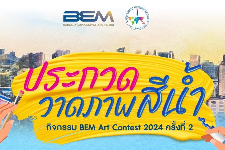 บริษัท ทางด่วนและรถไฟฟ้ากรุงเทพ จำกัด (มหาชน) หรือ BEM ผู้ให้บริการทางพิเศษและรถไฟฟ้าสายสีน้ำเงินและสายสีม่วง และเครือข่ายสมาคมสีน้ำโลก IWS ประเทศไทย (International Watercolor Society) เปิดโอกาสให้น้อง ๆ เยาวชน นักเรียน นิสิต นักศึกษา และประชาชนทั่วไปได้แสดงความสามารถด้านศิลปะ ผ่านการประกวดวาดภาพสีน้ำ ในกิจกรรม “BEM Art Contest ครั้งที่ 2 ประจำปี 2567” ภายใต้ Concept “ศิลปะของการเดินทาง” ประเภทนักเรียนระดับมัธยมศึกษาตอนปลาย (ม.4-6) และประเภทประชาชนทั่วไปที่มีใจรักด้านศิลปะ (อายุตั้งแต่ 18 ปีขึ้นไป) ชิงรางวัลมูลค่ารวมกว่า 80,000 บาท พร้อมใบประกาศนียบัตร โดยจัดการประกวดพร้อมตัดสินและมอบรางวัลในวันที่ 22 พฤศจิกายน 2567 ณ ห้อง Art Learning Centre รถไฟฟ้า MRT สถานีพหลโยธิน