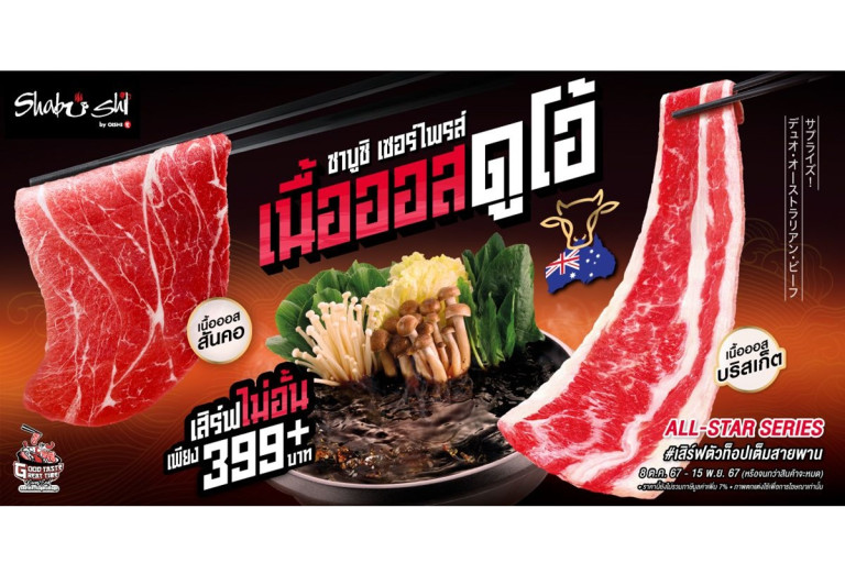 ยกขบวนวัตถุดิบชั้นยอดมาให้บริการเพิ่มเติมอย่างต่อเนื่องสำหรับ “ชาบูชิ” (Shabushi) ล่าสุด!!! ทำเซอร์ไพรส์เอาใจสายเนื้อออสฯ พร้อมเปิดแคมเปญ ชาบูชิ เซอร์ไพรส์ เนื้อออสดูโอ้ ภายใต้ธีมหลัก Shabushi ALL-STAR SERIES #เสิร์ฟตัวท็อปเต็มสายพาน แท็กทีมเมนูตัวท็อป จัดเต็มบนสายพาน สำหรับคนรักชาบู – ชาบู ทั้ง เนื้อออสเตรเลีย “สันคอ” และ เนื้อออสเตรเลีย “บริสเก็ต” ที่เด่นในเรื่องรสสัมผัสเข้มข้น หอมฉ่ำ เป็นเอกลักษณ์ รับประทานกับน้ำซุปสูตรใดก็อร่อย เสิร์ฟฟรีไม่อั้น พร้อมเมนูปกติอื่น ๆ อาทิ เนื้อเซอร์ลอยด์, เนื้อฮารามิ, หมูสไลซ์, เบคอน, กุ้ง, หมึก, และอีกมากมายล้นสายพาน รวมแล้วกว่า 80 รายการ ในราคาสุดคุ้ม เริ่มต้นเพียงคนละ 399 บาท+ (รวมเครื่องดื่ม, ผลไม้, และไอศกรีม)ที่ ชาบูชิ ทุกสาขาทั่วไทย ตั้งแต่ 8 ตุลาคม 2567 – 15 พฤศจิกายน 2567 หรือจนกว่าสินค้าจะหมด