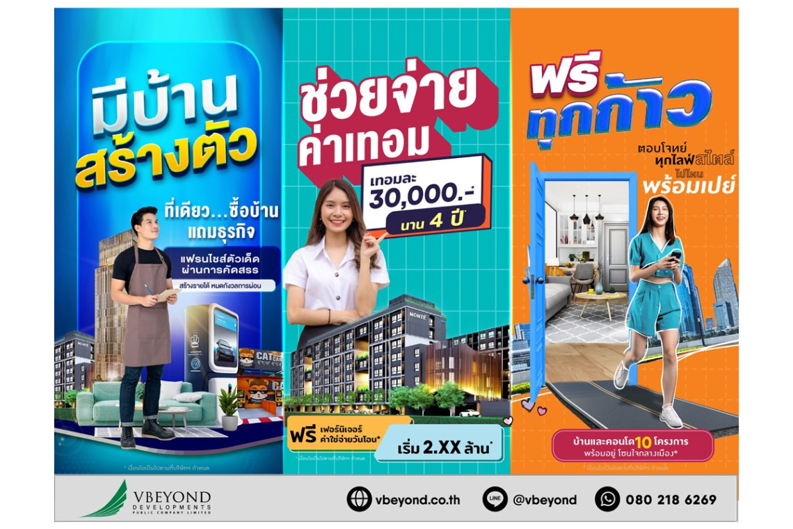 นอกจากนี้ยังขยายฐานลูกค้าครอบคลุมทุกกลุ่มเจนเนอเรชั่นกับอีก 2 โปรโมชั่นเอาใจคนรุ่นใหม่ “โปรฟรีทุกก้าว” เริ่มต้นการเดินทางสู่บ้านหลังใหม่พร้อมโปรโมชั่นฟรีหลากหลายค่าใช้จ่ายตาม Lifestyle ของลูกค้า ไม่ว่าจะเป็นร้านอาหารระดับมิชลิน ช้อปปิ้งออนไลน์ ค่าน้ำมัน ค่าเดินทางต่างๆก็ฟรีที่จะช่วยให้การใช้ชีวิตของคุณง่ายขึ้นกว่าเดิม และ “โปรช่วยค่าเทอม” ให้การเรียนเป็นเรื่องง่าย ช่วยจ่ายค่าเทอมให้ตลอด 4 ปี โดยโปรโมชั่นดังกล่าวเริ่มตั้งแต่วันที่ 1 ต.ค.- 31 ธ.ค. 2567 สอบถามรายละเอียดโปรโมชั่นเพิ่มเติม โทร 080-2186269 หรือ https://www.facebook.com/VBeyondDevelopmentTH