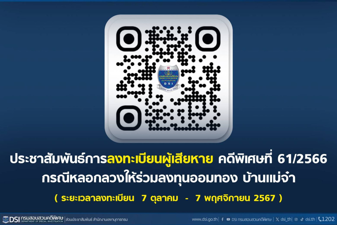 DSI แจ้งผู้เสียหายคดีพิเศษที่ 61/2566 กรณี หลอกลวงให้ร่วมลงทุน “ออมทองแม่จ๋า” ลงทะเบียนนัดหมายมาให้ถ้อยคำ