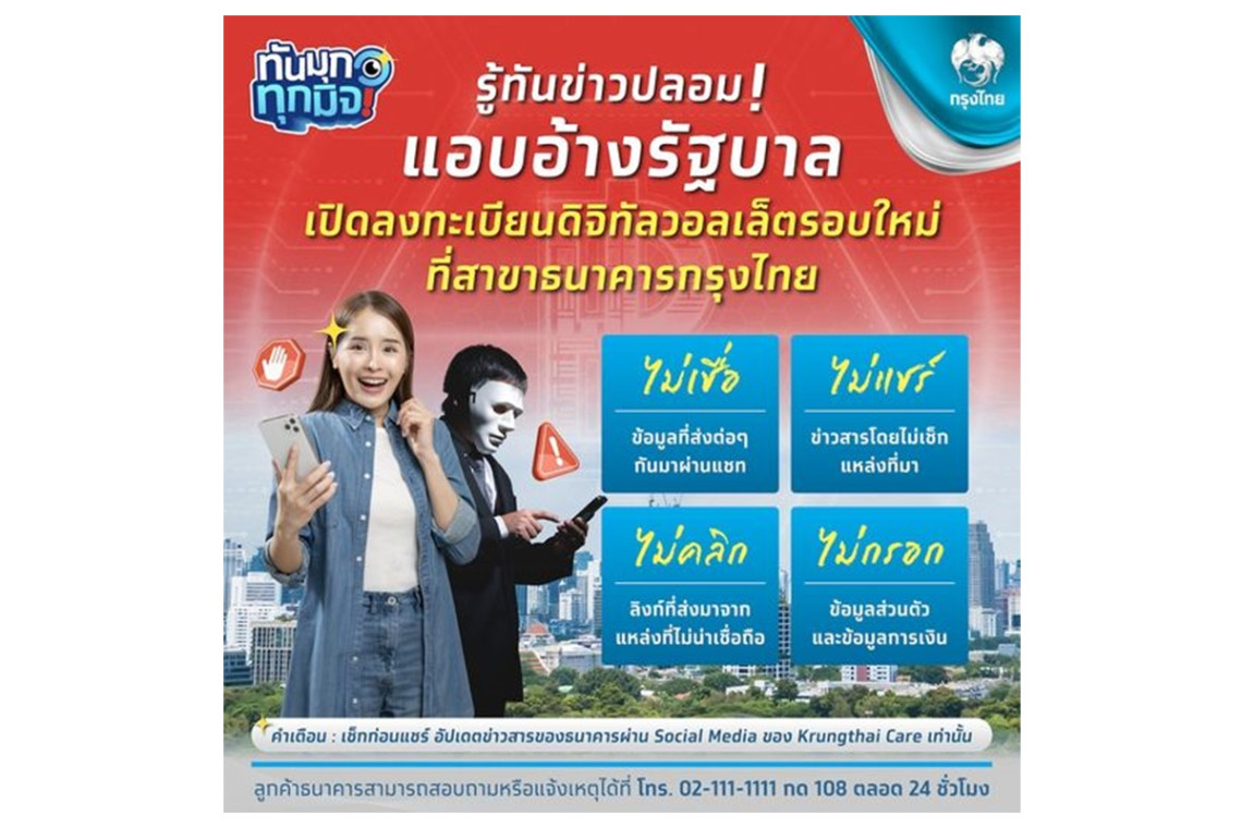 ธนาคารกรุงไทย โพสต์ข้อความผ่านเฟซบุ๊กชื่อ Krungthai Care แจ้งเตือนว่า ทันมุกทุกมิจ รู้ทันข่าวปลอม! แอบอ้างรัฐบาล เปิดลงทะเบียนดิจิทัลวอลเล็ตรอบใหม่ที่สาขาธนาคารกรุงไทย