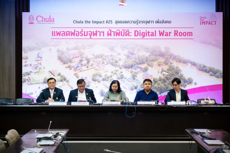 จุฬาลงกรณ์มหาวิทยาลัยจัดงานเสวนาวิชาการ Chula the Impact ครั้งที่ 25 เรื่อง “แพลตฟอร์มจุฬาฯ ฝ่าพิบัติ: Digital War Room” เพื่อนำเสนอนวัตกรรมจากคณาจารย์นักวิจัยจุฬาฯ ที่บูรณาการองค์ความรู้ทางวิชาการในการป้องกันและแก้ปัญหาอุทกภัยที่เกิดขึ้น สามารถชี้จุด คาดคะเน และให้ข้อมูลเกี่ยวกับสถานการณ์นำท่วมแก่ผู้ประสบอุทกภัยในพื้นที่ได้อย่างแม่นยำและทันสมัย เพื่อเตรียมความพร้อมในการรับมือและแก้ปัญหาได้ตรงจุดและทันท่วงที