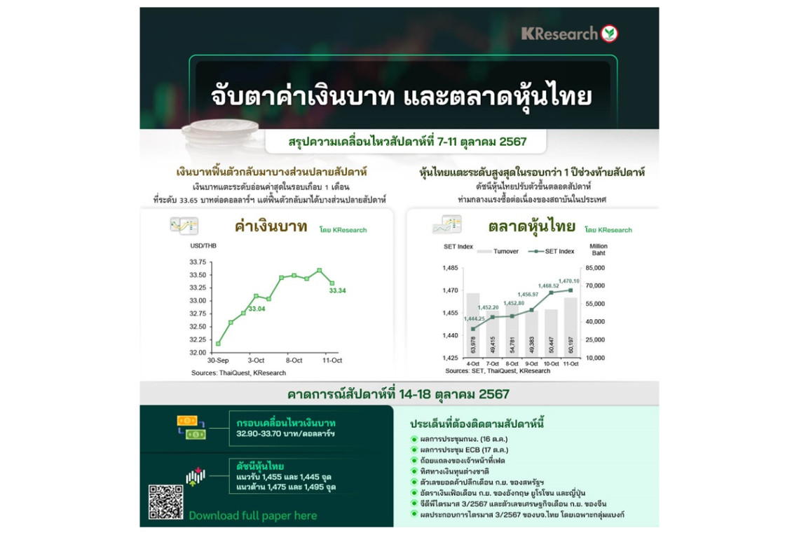 สัปดาห์ระหว่างวันที่ 14-18 ต.ค.2567 KBank คาดกรอบการเคลื่อนไหวของเงินบาทที่ 32.90-33.70 บาทต่อดอลลาร์ฯ ปัจจัยที่ต้องติดตาม ได้แก่ ผลการประชุมกนง. (16 ต.ค.) ผลการประชุม ECB (17 ต.ค.) ทิศทางเงินทุนต่างชาติ สถานการณ์สกุลเงินเอเชีย ถ้อยแถลงของเจ้าหน้าที่เฟด ตัวเลขคาดการณ์เงินเฟ้อของผู้บริโภคและยอดค้าปลีกเดือนก.ย. ของสหรัฐฯ อัตราเงินเฟ้อเดือนก.ย. ของอังกฤษ ยูโรโซน และญี่ปุ่น ตลอดจนข้อมูลจีดีพีไตรมาส 3/2567 และข้อมูลเศรษฐกิจเดือนก.ย. ของจีนด้วยเช่นกัน