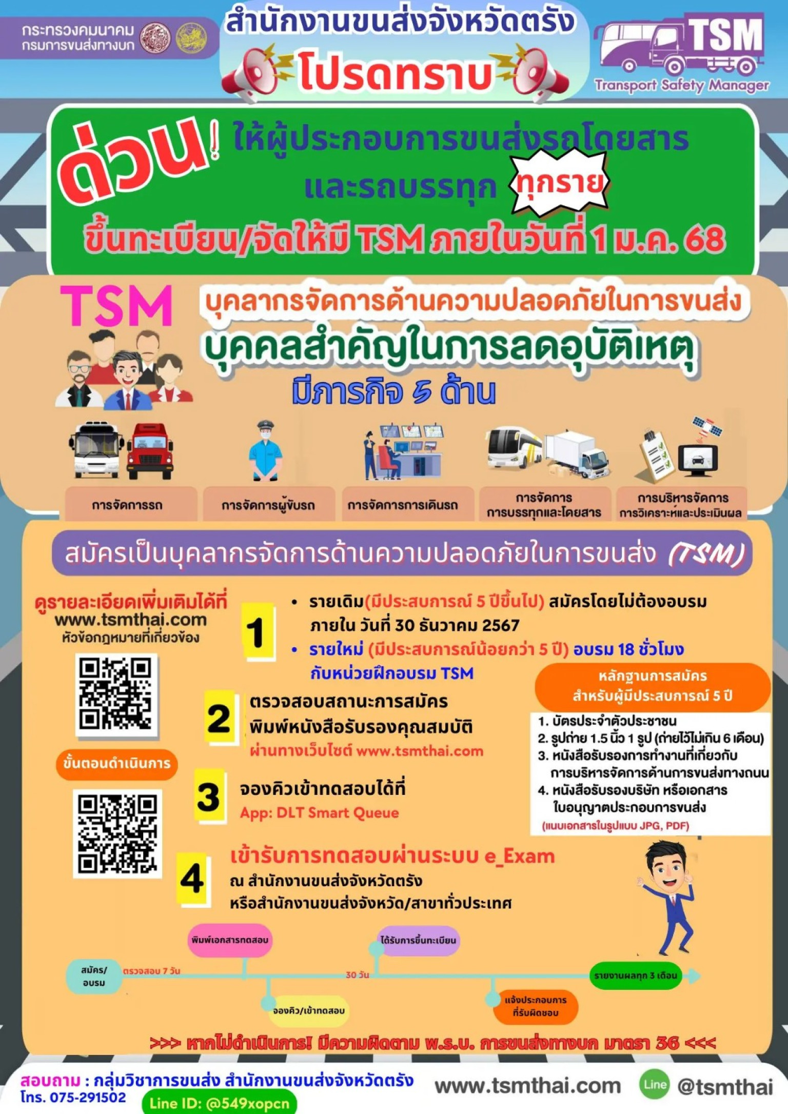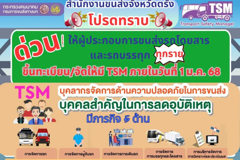 สำนักงานขนส่งจังหวัดตรัง ขอให้ผู้ประกอบการขนส่งทุกราย ดำเนินการขึ้นทะเบียน/จัดให้มีบุคลากรจัดการด้านความปลอดภัยในการขนส่ง : TSM เพื่อรับรองประกอบการขนส่งของตนเองโดยด่วน ภายในวันที่ 1 มกราคม 2568