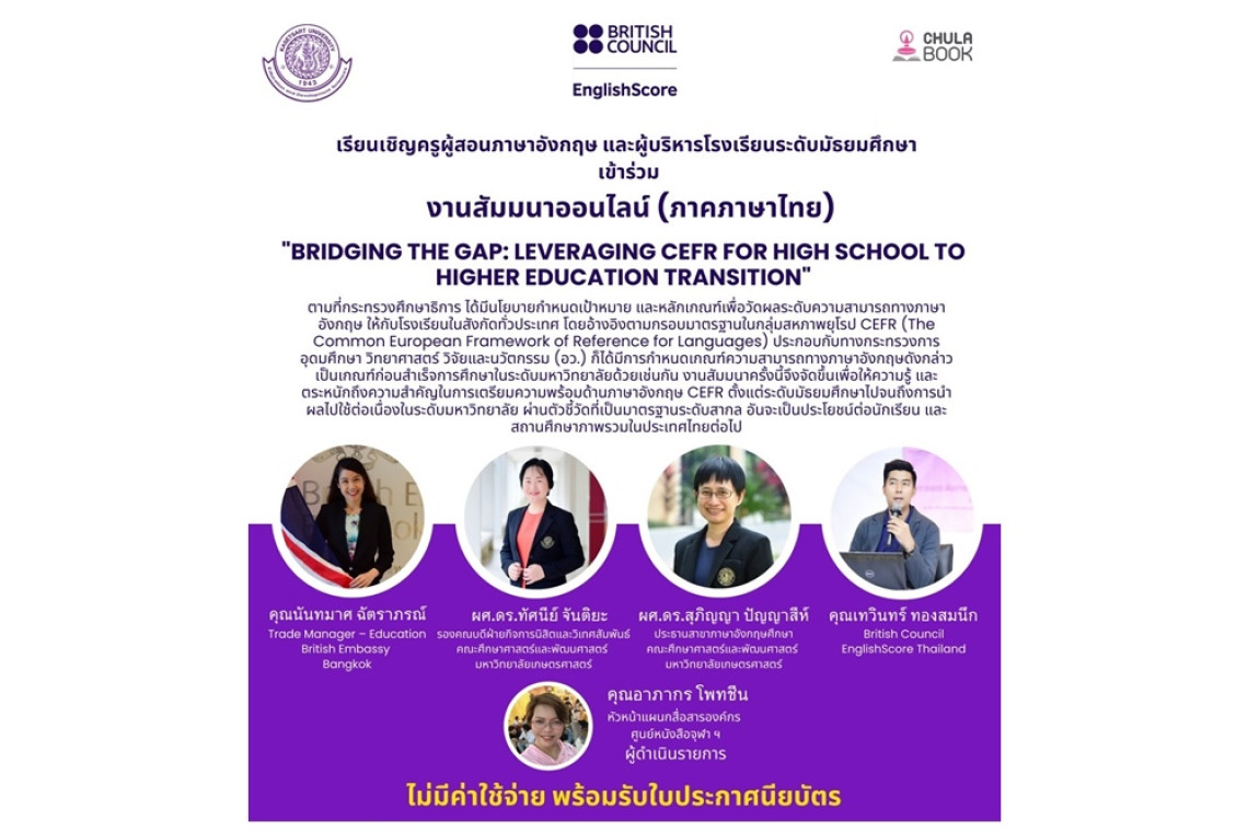 ศูนย์หนังสือจุฬาฯ ร่วมกับ คณะศึกษาศาสตร์และพัฒนศาสตร์ มหาวิทยาลัยเกษตรศาสตร์ และ British Council EnglishScore (Thailand) ขอเรียนเชิญครูผู้สอนภาษาอังกฤษ และผู้บริหารโรงเรียนระดับมัธยมศึกษา เข้าร่วมงานสัมมนาออนไลน์ (ภาคภาษาไทย) หัวข้อ “BRIDGING THE GAP : LEVERAGING CEFR FOR HIGH SCHOOL TO HIGHER EDUCATION TRANSITION” ในวันอังคารที่ 22 ตุลาคม 2567 เวลา 9.30-11.40 น. ผ่านโปรแกรม Zoom (ไม่มีค่าใช้จ่าย)
