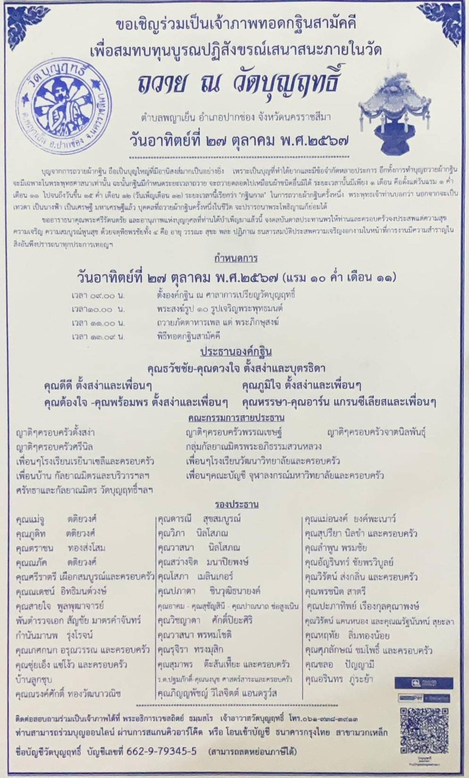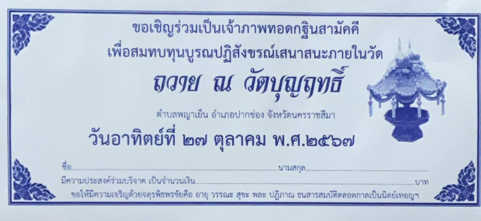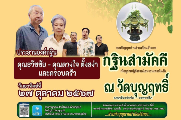 คุณธวัชชัย – คุณดวงใจ ตั้งสง่า และครอบครัว ขอเชิญร่วมเป็นเจ้าภาพทอดกฐินสามัคคี เพื่อสมทบทุนบูรณปฏิสังขรณ์เสนาสนะภายในวัด ณ วัดบุญฤทธิ์ ตำบลพญาเย็น อำเภอปากช่อง จังหวัดนครราชสีมา วันอาทิตย์ที่ 27 ตุลาคม 2567