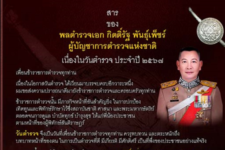 เมื่อวันที่ 17 ตุลาคม 2567 ที่สำนักงานตำรวจแห่งชาติ (ตร.) พล.ต.อ.กิตติ์รัฐ พันธุ์เพ็ชร์ ผู้บัญชาการตำรวจแห่งชาติ (ผบ.ตร.) ออกสาร “วันตำรวจ” ใจความว่า...