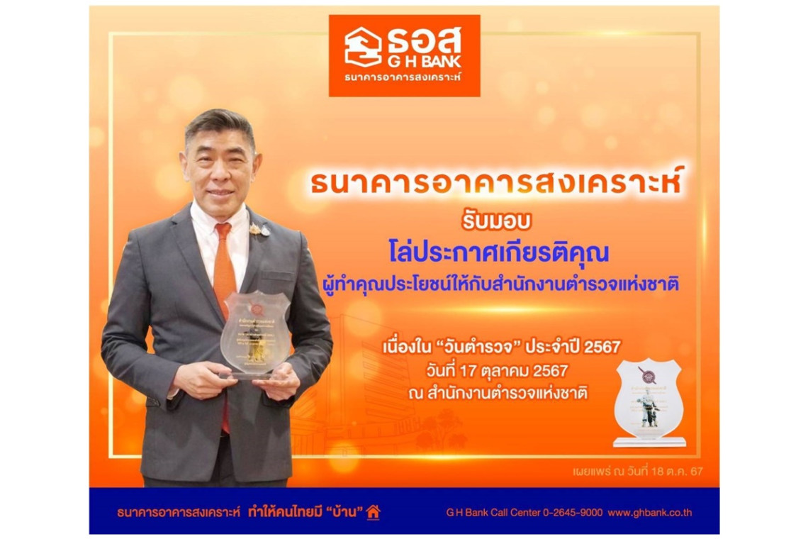 ธนาคารอาคารสงเคราะห์ (ธอส.) รับมอบ “โล่ประกาศเกียรติคุณผู้ทำคุณประโยชน์ให้กับสำนักงานตำรวจแห่งชาติ ประจำปี 2567” จากสำนักงานตำรวจแห่งชาติ ในฐานะที่ธนาคารได้ให้การสนับสนุนและสร้างคุณประโยชน์ในกิจการของกองบัญชาการตำรวจตระเวนชายแดนให้สำเร็จลุล่วงตามวัตถุประสงค์ซึ่งเป็นการช่วยยกระดับคุณภาพชีวิตและคุณภาพการศึกษาให้แก่นักเรียนและครูของโรงเรียนในสังกัดกองบัญชาการตำรวจตระเวนชายแดนมาอย่างต่อเนื่อง