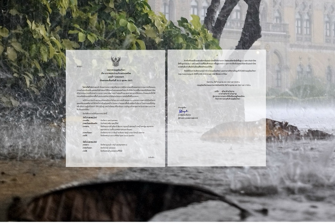 วันที่ 20 ต.ค.67 กรมอุตุนิยมวิทยา ออกประกาศฉบับที่ 7 เรื่อง อากาศแปรปรวนบริเวณประเทศไทย (มีผลกระทบตั้งแต่วันที่ 20-21 ตุลาคม 2567) ความว่า...