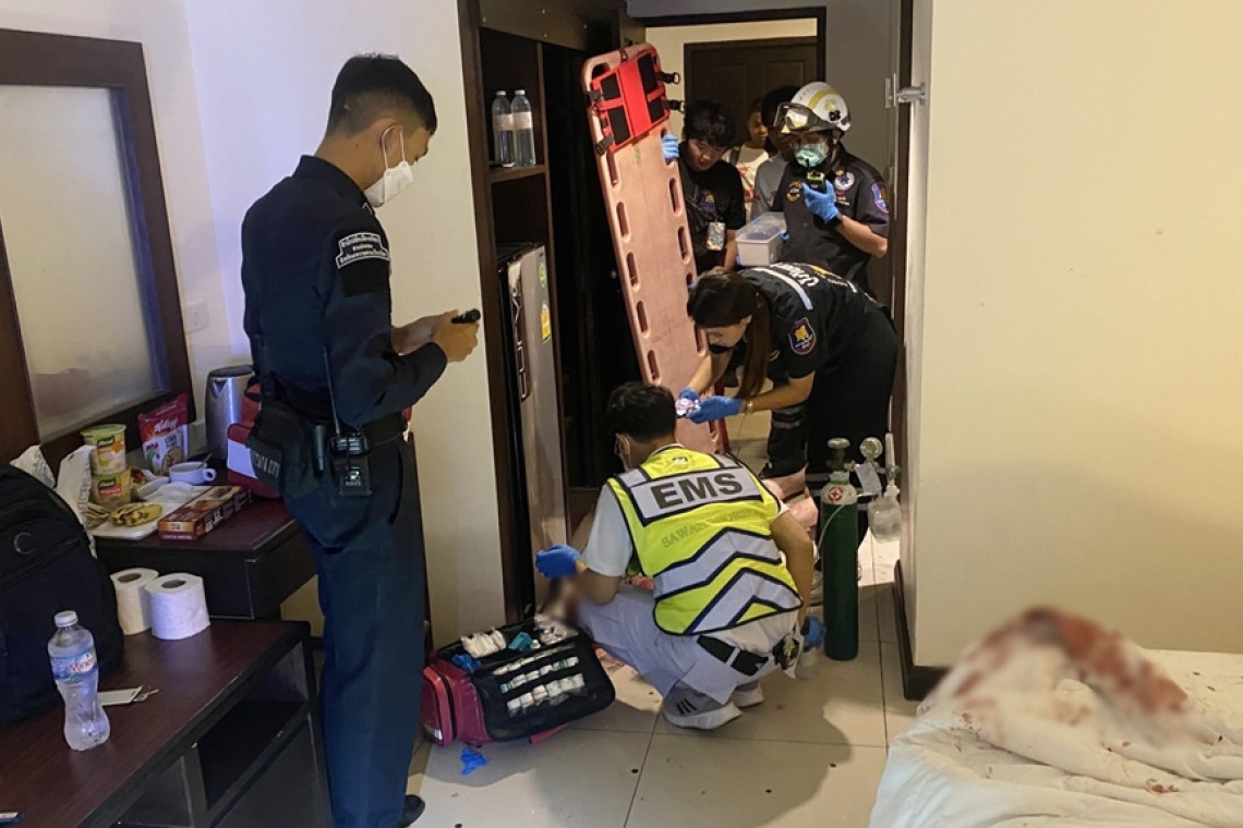 สอบถามเพิ่มเติมจาก เจ้าหน้าที่มูลนิธิสว่างบริบูรณ์เมืองพัทยา บอกว่า หลังจากได้รับแจ้งเหตุมีนักท่องเที่ยวคุ้มคลั่งทำลายตัวเองภายในห้องพัก จึงรีบนำกำลังมาตรวจสอบพบนักท่องเที่ยวนอนจมกองเลือดและเลือดไหลออกมาเป็นจำนวนมาก ที่บริเวณใบหน้ามีบาดแผลคาดว่าน่าจะทำร้ายตัวเองและนอนหมดสติอยู่ที่หน้าห้องน้ำ