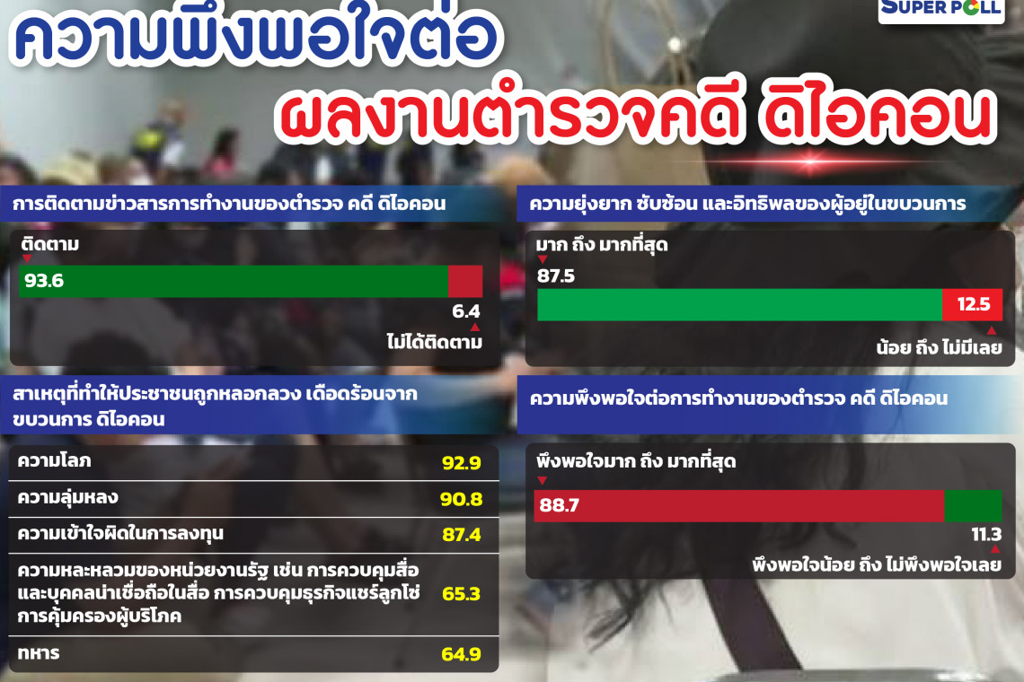 วันที่ 20 ต.ค.67 สำนักวิจัย ซูเปอร์โพล เสนอผลสำรวจเรื่อง ความพึงพอใจต่อผลงานตำรวจคดี ดิไอคอน กรณีศึกษาตัวอย่างประชาชนทุกสาขาอาชีพทั่วประเทศ ดำเนินโครงการทั้งการวิจัยเชิงปริมาณ (Quantitative Research) และการวิจัยเชิงคุณภาพ (Qualitative Research) รวมจำนวนตัวอย่างในการวิเคราะห์ทางสถิติทั้งสิ้น จำนวนทั้งสิ้น 1,160 ตัวอย่าง ดำเนินโครงการระหว่างวันที่ 17 - 19 ตุลาคม พ.ศ.2567 ที่ผ่านมา