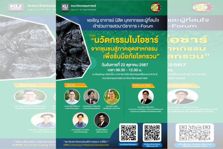 คณะวิศวกรรมศาสตร์ มหาวิทยาลัยเกษตรศาสตร์ ขอเชิญอาจารย์ นิสิต บุคลากร และผู้สนใจ เข้าร่วมการเสวนาวิชาการ i-Forum หัวข้อ นวัตกรรมไบโอชาร์ จากชุมชนสู่ภาคอุตสาหกรรม เพื่อรับมือภัยโลกรวน ในวันอังคารที่ 22 ตุลาคม 2567 เวลา 09.30 - 12.00 น. ณ ห้องประชุม 5404 ชั้น 4 อาคารภาควิชาวิศวกรรมเครื่องกล (อาคาร 5) คณะวิศวกรรมศาสตร์ มหาวิทยาลัยเกษตรศาสตร์