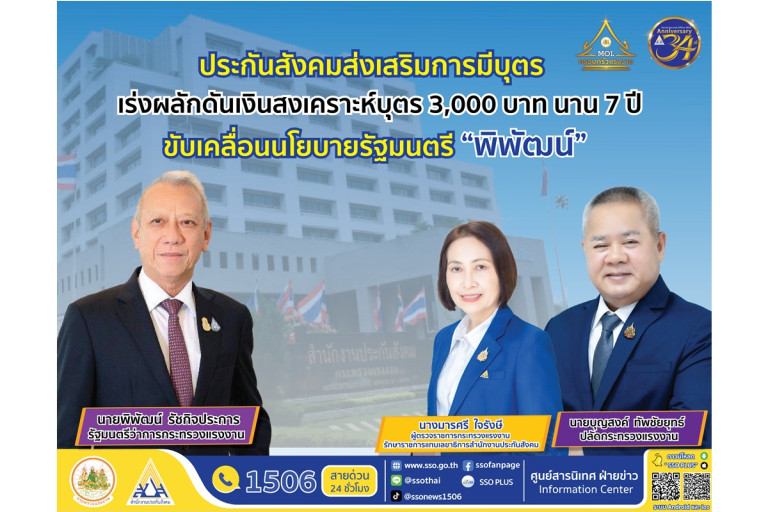 ประกันสังคมขานรับนโยบายการเพิ่มสิทธิประโยชน์กรณีสงเคราะห์บุตรเพื่อส่งเสริมการมีบุตร เร่งผลักดันเงินสงเคราะห์บุตร 3 พันบาทนาน 7 ปี ตามแนวคิดของ รมว.แรงงาน โดยเร่งศึกษาแนวทางการดำเนินงานที่เหมาะสมตามหลักคณิตศาสตร์ประกันภัย