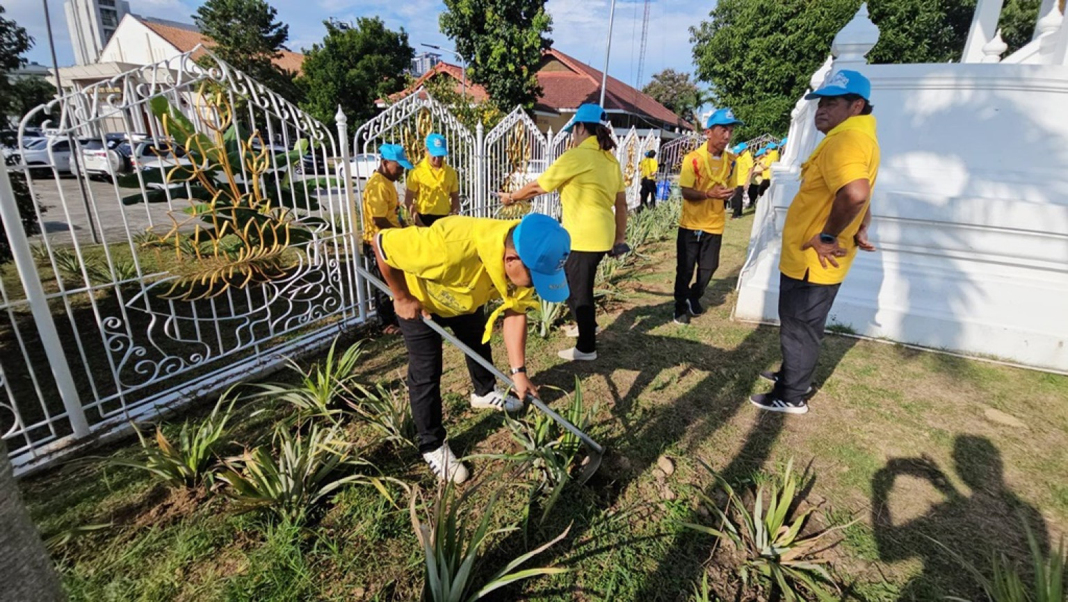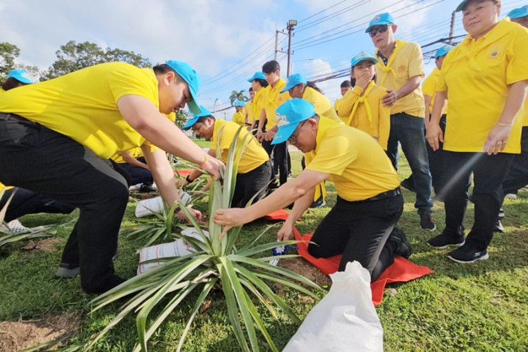 วันที่ 22 ต.ค.67 ที่สนามหน้าพระบรมราชานุสาวรีย์ พระบาทสมเด็จพระจุลจอมเกล้าเจ้าอยู่หัว รัชกาลที่ 5 นายนพรัตน์ ศรีพรหม นายอำเภอศรีราชา พร้อมปลัดอำเภอ ข้าราชการ ชมรมกำนันผู้ใหญ่บ้าน จิตอาสาพระราชทาน ได้เข้าร่วมกิจกรรมจิตอาสาพัฒนา ปลูกสับปะรด ครบรอบ 130 ปี ที่ว่าการอำเภอศรีราชา