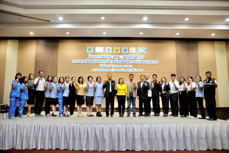 วันที่ 22 ตุลาคม 2567 สมาคมเพื่อนชุมชน จัดโครงการ "อบรม อสม. เชิงปฏิบัติการ การเจาะเลือดฝอยจากปลายนิ้วเพื่อคัดกรองโรคเบาหวาน" สานต่อเจตนารมณ์ของสมาคม ฯ ที่มีแนวคิดดูแลสุขภาพชุมชน โดยเน้นเชิงป้องกันและส่งเสริม สมาคม ฯ จึงได้ประสานความร่วมมือกับหน่วยงานด้านสาธารณสุขที่เกี่ยวข้อง อาทิ สาธารณสุขจังหวัดระยอง สาธารณสุขอำเภอเมืองระยอง สาธารณสุขอำเภอบ้านฉาง สาธารณสุขอำเภอนิคมพัฒนา เทศบาลเมืองมาบตาพุด เทศบาลตำบลบ้านฉาง เทศบาลตำบลเนินพระ เทศบาลตำบลทับมา เทศบาลตำบลมาบข่าพัฒนา โรงพยาบาลส่งเสริมสุขภาพตำบล ศูนย์บริการสาธารณสุข ในพื้นที่ดังกล่าว เพื่อบรรลุวัตถุประสงค์ให้อาสาสมัครสาธารณสุขประจำหมู่บ้าน (อสม.) และแกนนำชุมชน มีความรู้ ความเข้าใจหลักเกณฑ์ วิธีการ และเงื่อนไขต่าง ๆ ในการคัดกรองโรคเบาหวาน สามารถเจาะเลือดฝอยจากปลายนิ้วได้อย่างถูกต้องและปลอดภัย สามารถใช้และแก้ไขปัญหาเบื้องต้นกับเครื่องตรวจน้ำตาลในเลือดชนิดพกพาได้ รวมถึงรับทราบและปฏิบัติตามระเบียบกระทรวงสาธารณสุขที่เกี่ยวข้อง โดยได้รับเกียรติจาก นางวิลาวัลย์ เอี่ยมสอาด นักวิชาการสาธารณสุขเชี่ยวชาญ (ด้านส่งเสริมพัฒนา) เป็นประธานในพิธี และได้รับความอนุเคราะห์จากทีมวิทยากร ผู้ประกอบวิชาชีพเทคนิคการแพทย์จากโรงพยาบาลระยอง มาให้ความรู้และหลักเกณฑ์ต่าง ๆ ณ ห้องสร้อยเพชร โรงแรมโกลเด้น ซิตี้ ระยอง