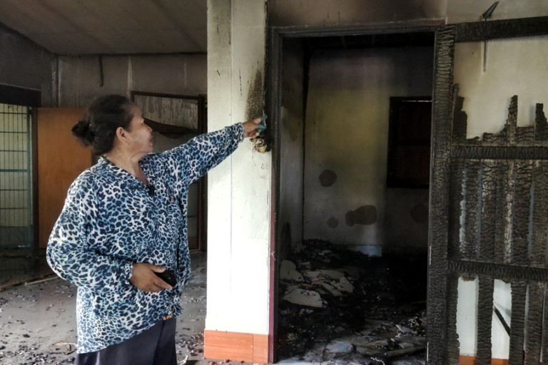 หลังจากกินข้าวได้ไม่นานหลานชายก็กลับมาที่บ้านเกิดเหตุจากนั้นก็มีกลุ่มควันลอยออกจากบ้านจึงรีบพากันมาดูก็พบว่ามีไฟไหม้จึงรีบแจ้งดับเพลิงและตำรวจมาช่วยดับแต่เนื่องจากประตูหน้าต่างถูกล็อกเจ้าหน้าที่จึงงัดหน้าต่างด้านหลังเข้าไปฉีดน้ำดับไฟที่กำลังลุกไหม้ที่ห้องนอน ครั้งแรกคิดว่าหลานชายหนีออกไปแล้วแต่ปรากฏว่าสำลักควันหมดสติอยู่หน้าประตูทางเข้าบ้านจึงนำส่งโรงพยาบาล