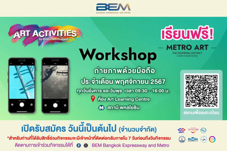 บริษัท ทางด่วนและรถไฟฟ้ากรุงเทพ จำกัด (มหาชน) หรือ BEM ขอชวนมาเปิดประสบการณ์การถ่ายภาพที่แตกต่างออกไปผ่าน Workshop "ถ่ายภาพด้วยมือถือ" โดย อาจารย์ธีรพงศ์ เสรีสำราญ อาจารย์ด้านศิลปะภาพยนตร์ และที่ปรึกษาด้านประวัติศาสตร์และปรัชญาศิลปะของ IWS THAILAND ที่จะพาคุณไปเปิดมุมมองใหม่เพื่อค้นพบความงามที่ซ่อนอยู่ในชีวิตประจำวัน เรียนรู้การสังเกตสิ่งรอบตัว พร้อมถ่ายทอดเทคนิคการถ่ายภาพที่หลากหลายด้วยโทรศัพท์มือถือเล็กๆ เพียงเครื่องเดียว ทั้งการถ่ายภาพเชิงนามธรรมและกึ่งนามธรรม แล้วทุกคนอาจจะค้นพบศักยภาพที่เกินขีดจำกัดของตัวเอง