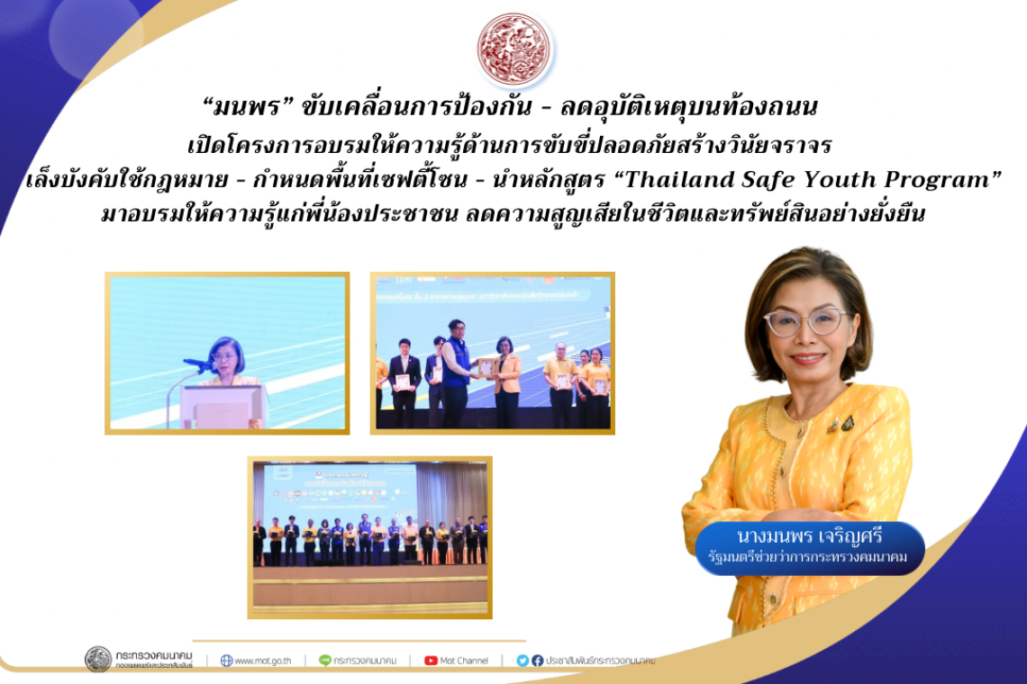 “มนพร” ขับเคลื่อนการป้องกัน - ลดอุบัติเหตุบนท้องถนน เปิดโครงการอบรมให้ความรู้ด้านการขับขี่ปลอดภัยสร้างวินัยจราจร เล็งบังคับใช้กฎหมาย - กำหนดพื้นที่เซฟตี้โซน - นำหลักสูตร “Thailand Safe Youth Program” มาอบรมให้ความรู้แก่พี่น้องประชาชน ลดความสูญเสีย