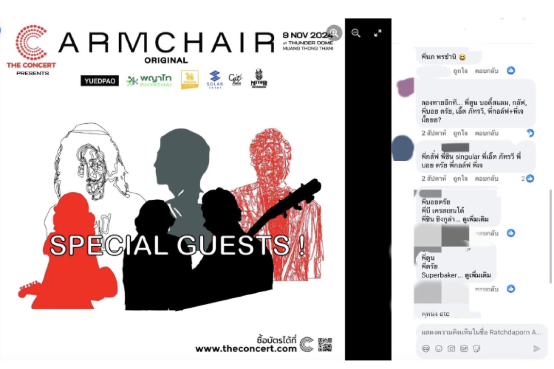 ถ้าอยากรู้ว่าภาพจากเงาปริศนาตัวจริงของพวกเขาจะเป็นใครกันบ้างนั้น??? รีบกดบัตรแล้วมานั่งชม นั่งลุ้นไปพร้อมกันกับคอนเสิร์ตใหญ่เต็มรูปแบบที่มี Line Up ARMCHAIR Original ทั้ง 4 คน ที่จะได้ร่วมเล่นด้วยกันครั้งสุดท้าย ใน THE CONCERT Present “ARMCHAIR Original Concert” เพียงรอบการแสดงเดียวเท่านั้น ในวัน เสาร์ ที่ 9 พฤศจิกายน 2567 เวลา 19.00 น. สถานที่ : THUNDER DOME MUANG THONG THANI ซื้อบัตรได้ทาง The Concert Application : https://www.theconcert.com/concerts/armchair-original-concert เพราะนี่คืออีกหนึ่งคอนเสิร์ตแห่งปีที่ไม่อยากให้พลาดโดยเด็ดขาด