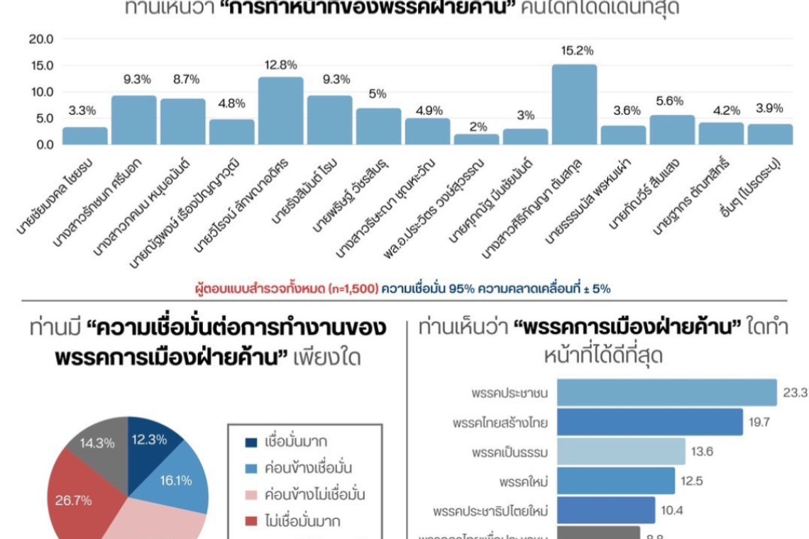 พร้อมทั้งสอบถามต่อว่าพรรคการเมืองฝ่ายค้านใดทำหน้าที่ได้ดีที่สุด 5 อันดับแรก พบว่า พรรคประชาชน 23.3% พรรคไทยสร้างไทย 19.7% พรรคเป็นธรรม 13.6% พรรคใหม่ 12.5% และพรรคประชาธิปไตยใหม่ 10.4%