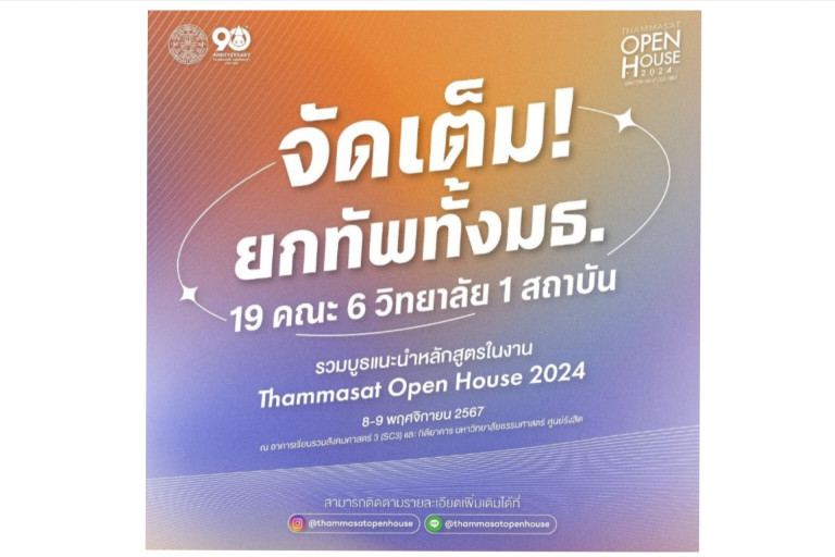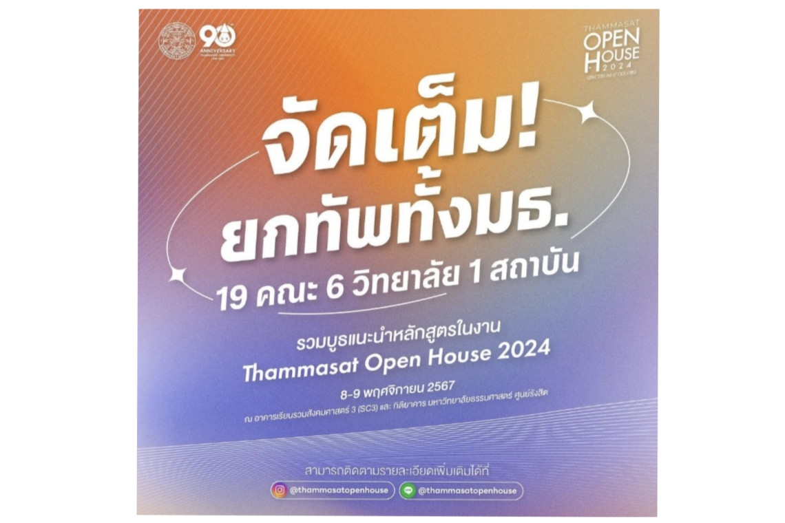 พบกันในวันที่ 8 - 9 พฤศจิกายน 2567 ณ อาคารเรียนรวมสังคมศาสตร์ 3 (SC3) และ กิติยาคาร มหาวิทยาลัยธรรมศาสตร์ ศูนย์รังสิต สามารถติดตามข่าวสารเพิ่มเติมได้ที่เฟซบุ๊ก Thammasat Open House และ Line OA : @thammasatopenhouse