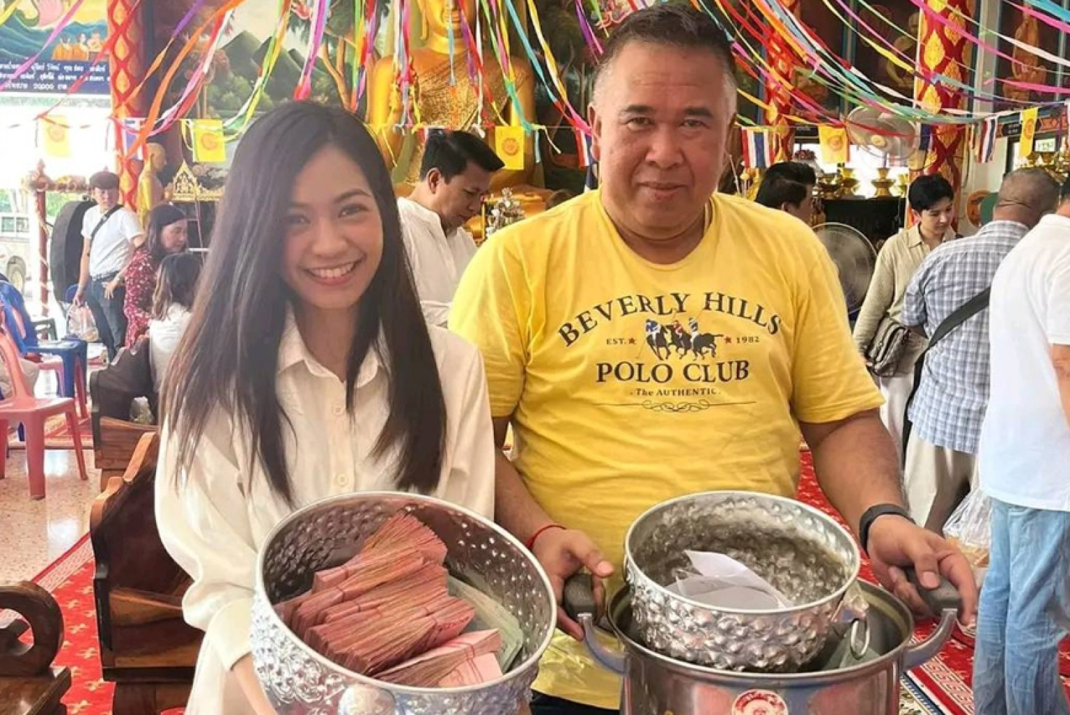 นายไพโรจน์ กล่าวว่าด้วยทางวัดสองพี่น้องจะได้ทำการสร้างพระอุโบสถ และศาลาอเนกประสงค์ แต่ยังไม่สมบูรณ์ยังขาดปัจจัยอีกเป็นจำนวนมาก ดังนั้นสมาคมผู้สื่อข่าวและช่างภาพอาชญากรรมแห่งประเทศไทย คณะกรรมการวัดสองพี่น้อง กำนัน ผู้ใหญ่บ้าน ตลอดจนทายกทายิกา ชาวบ้านทุกครอบครัว ได้พร้อมใจกันทำบุญกฐินสามัคคีขึ้นและในวันนี้ก็มีข้าราชการ พ่อค้า ประชาชนร่วมกันเป็นเจ้าภาพทอดกฐินเป็นจำนวนมาก