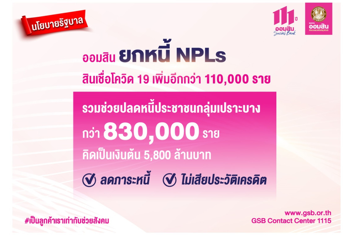 "ออมสิน" ยกหนี้ NPLs สินเชื่อโควิด 19 เพิ่มอีกกว่า 110,000 รายตามนโยบายรัฐ รวมช่วยปลดหนี้ประชาชนกลุ่มเปราะบางแล้วมากกว่า 830,000 ราย คิดเป็นเงินต้น 5,800 ล้านบาท