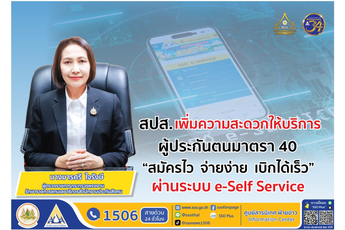 "ประกันสังคม" เพิ่มความสะดวกบริการผู้ประกันตนมาตรา 40 สมัครไว จ่ายง่าย เบิกได้เร็ว ผ่านระบบ e-Self Service